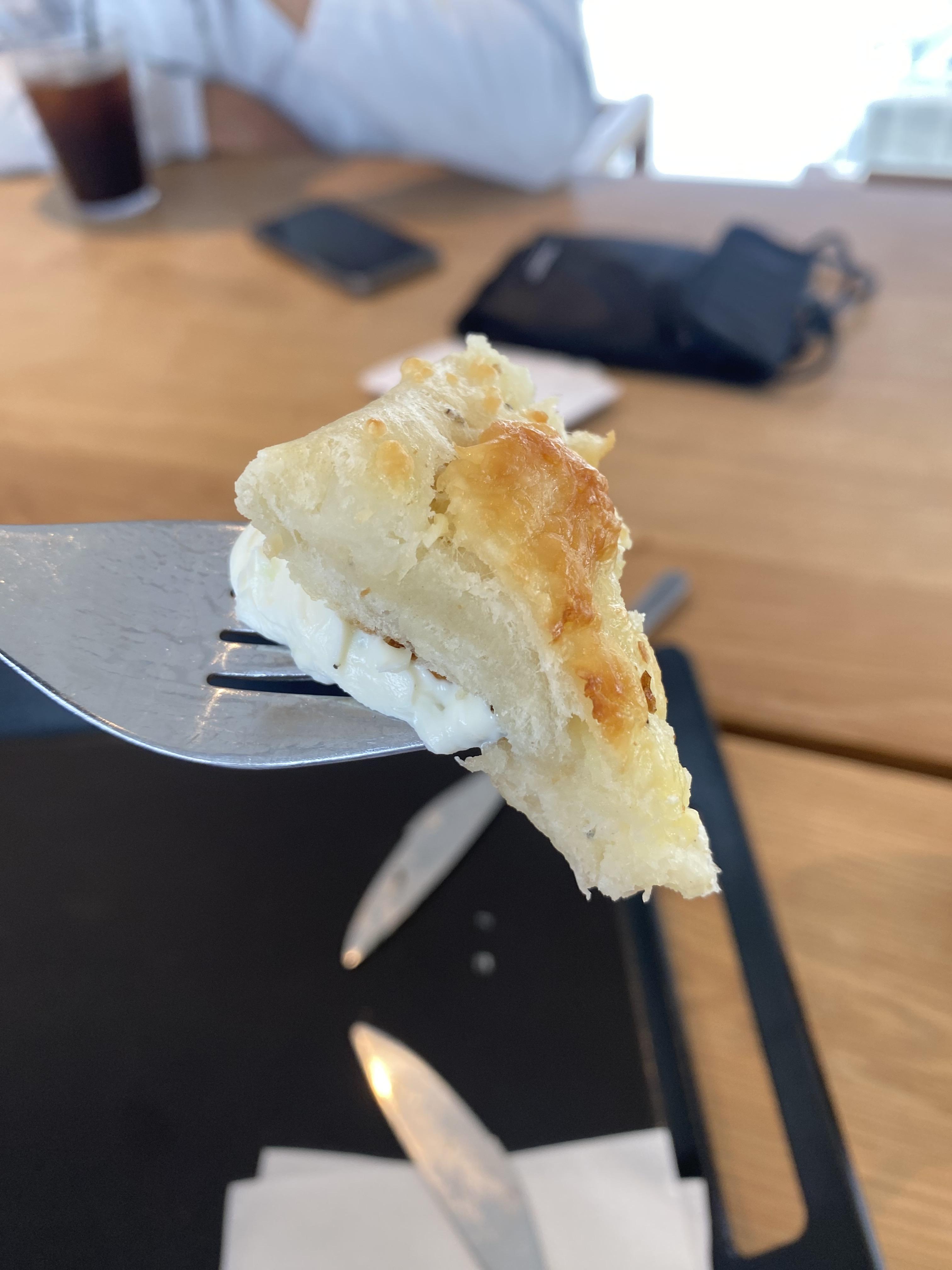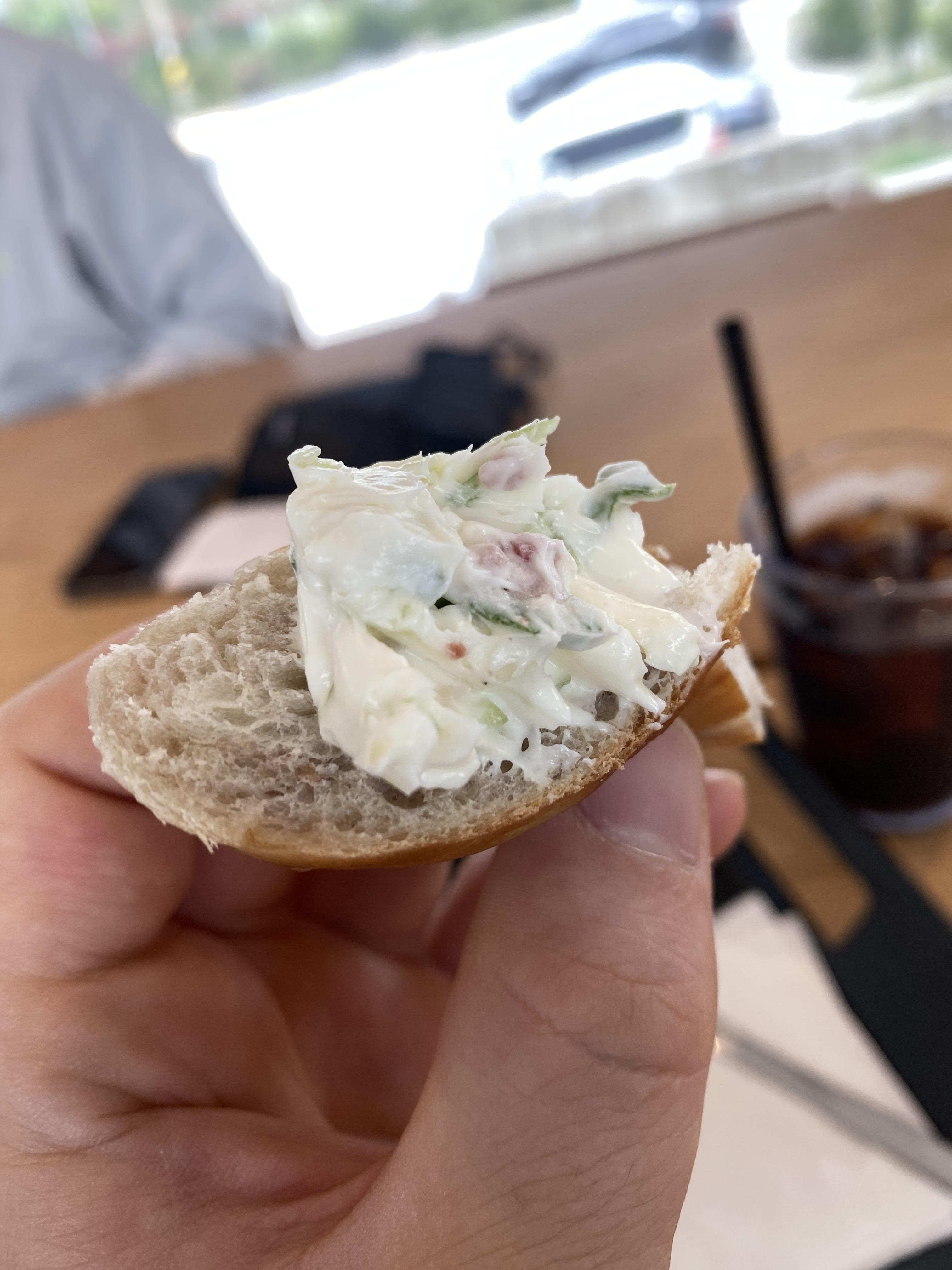 개인적으로는 바질 크림치즈가 들어간 빵이나 소스는 거의 모두 좋아해서 기대를 잔뜩 하고 먹어봤어요. 베이글 맛집이라고 소문난 만큼 잘 어우러지는 맛이 너무 맛있었어요. 나이프를 같이 주셔서 반으로 갈라 먹고 싶다면 셀프로 갈라 먹으면 됩니다.