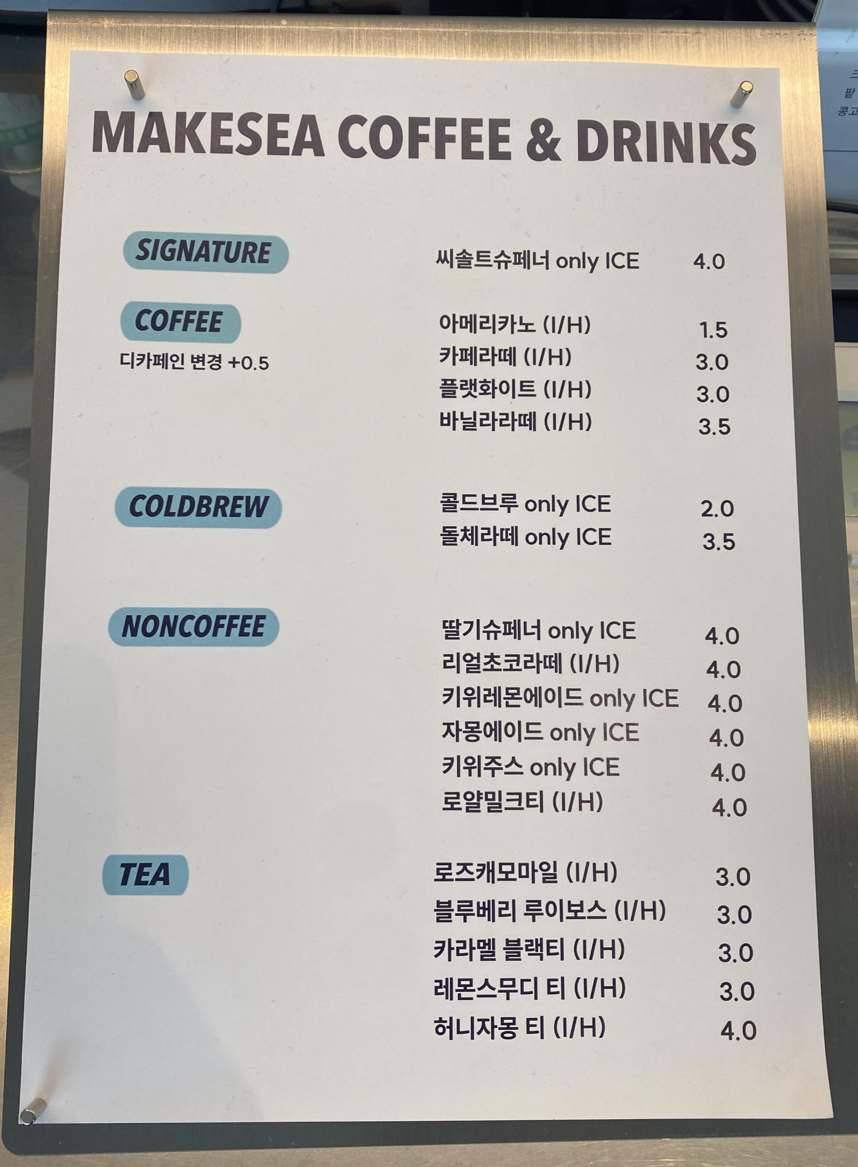 여느 대형카페에 비해 음료가 정말 저렴해서 놀랐어요. 보통 대형카페들은 음료가 기본 5,000원에서 6,000원은 기본이고 차(TEA) 경우에는 7,000원~8,000원까지도 하는데 '메이크씨'는 4,000원이 가장 비싼 음료 가격이었어요. 먼저 음료 가격부터가 너무 좋았습니다.