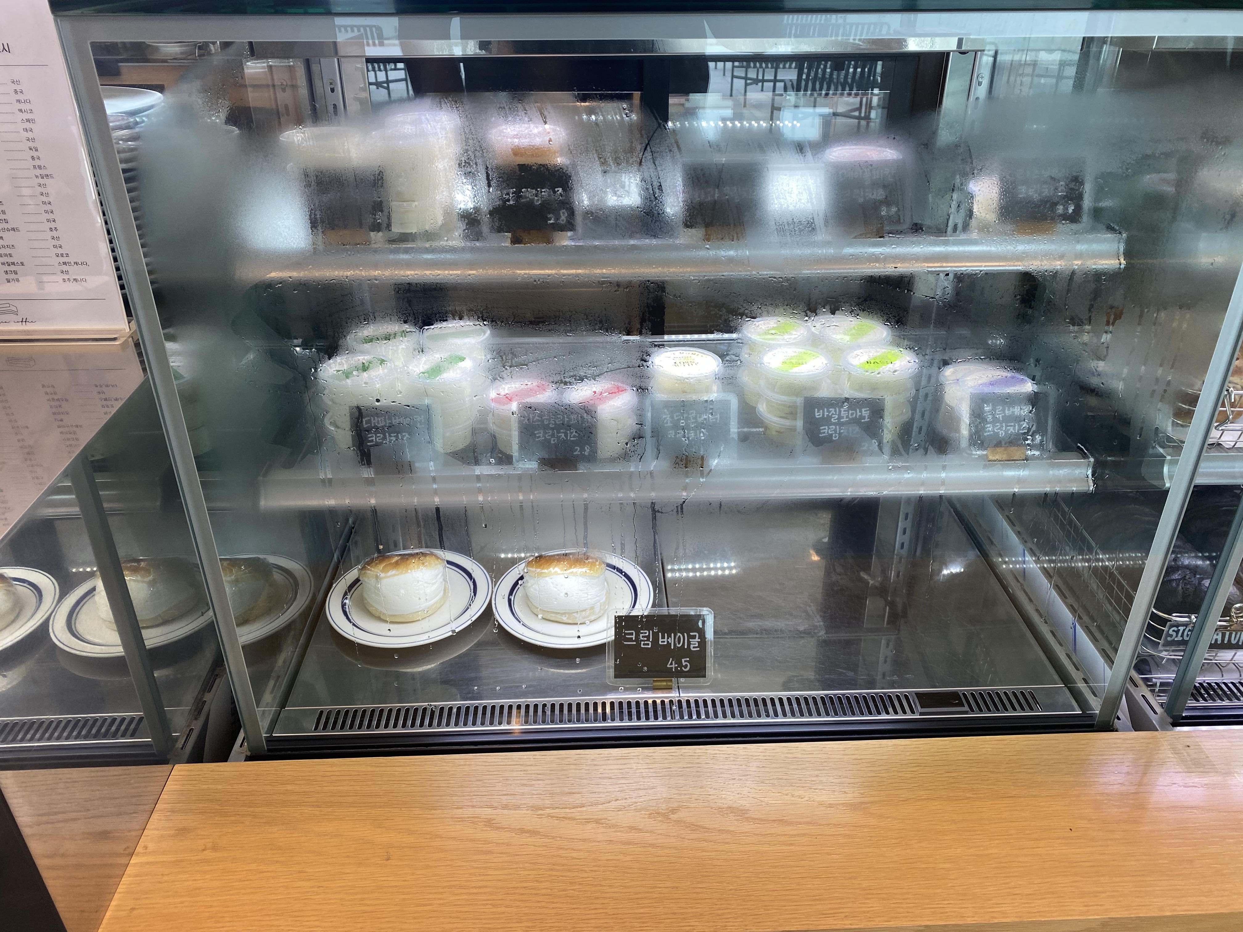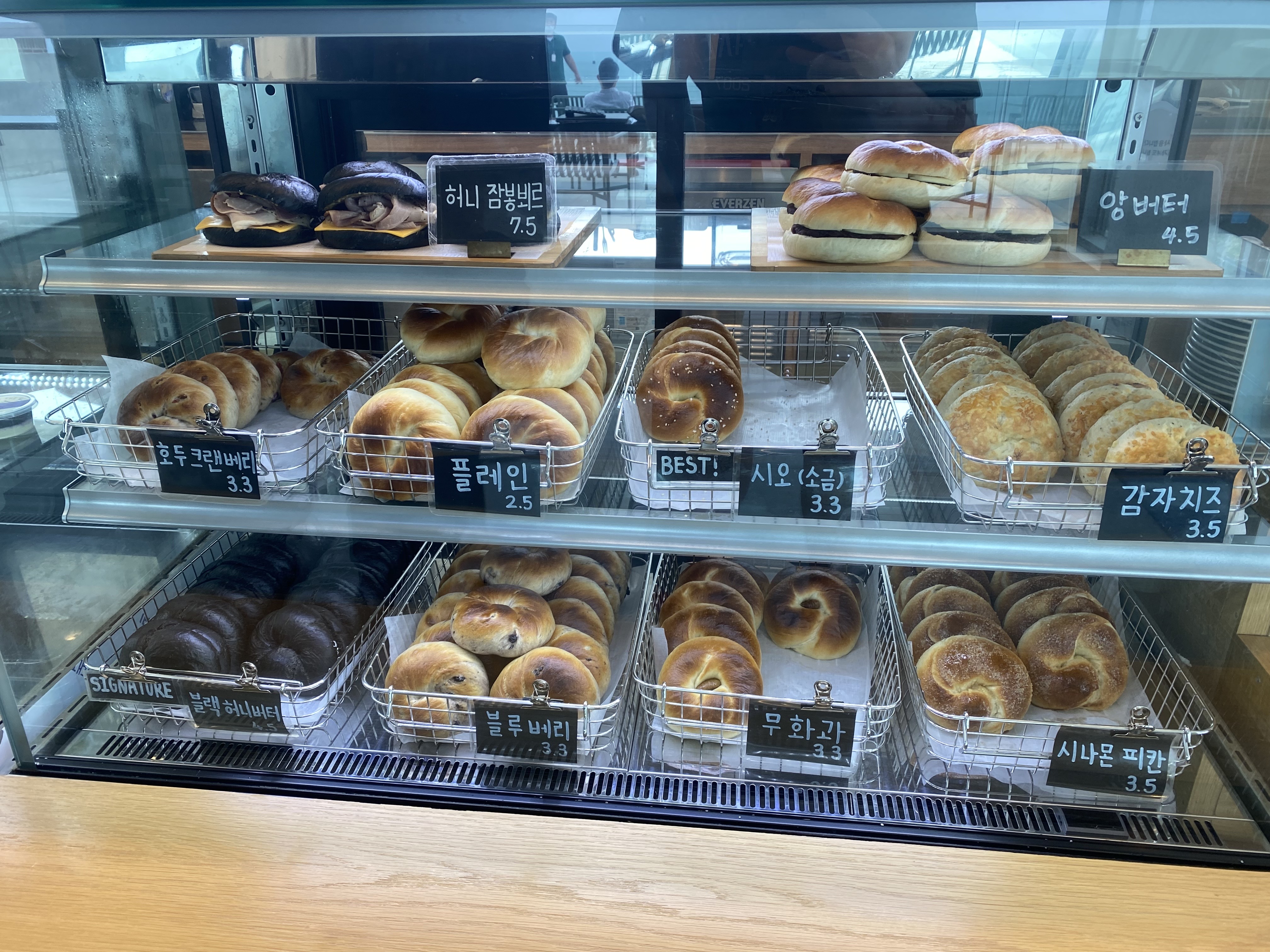 베이글 맛집 명성에 맞게 10개에 달하는 종류의 베이글들이 쌓여있었어요. 아무렴 Best 메뉴인 시오(소금) 베이글은 벌써 몇 개 남지 않았었어요. 베이글 쇼케이스 옆에는 크림치즈도 다양한 종류로 준비되어 있었습니다. 플레인, 뽀또, 무화과, 바질토마토, 블루베리, 초당콘버터, 대파베이컨, 치즈할라피뇨, 메이플피칸 등 취향 따라 선택해서 구매가능했습니다.