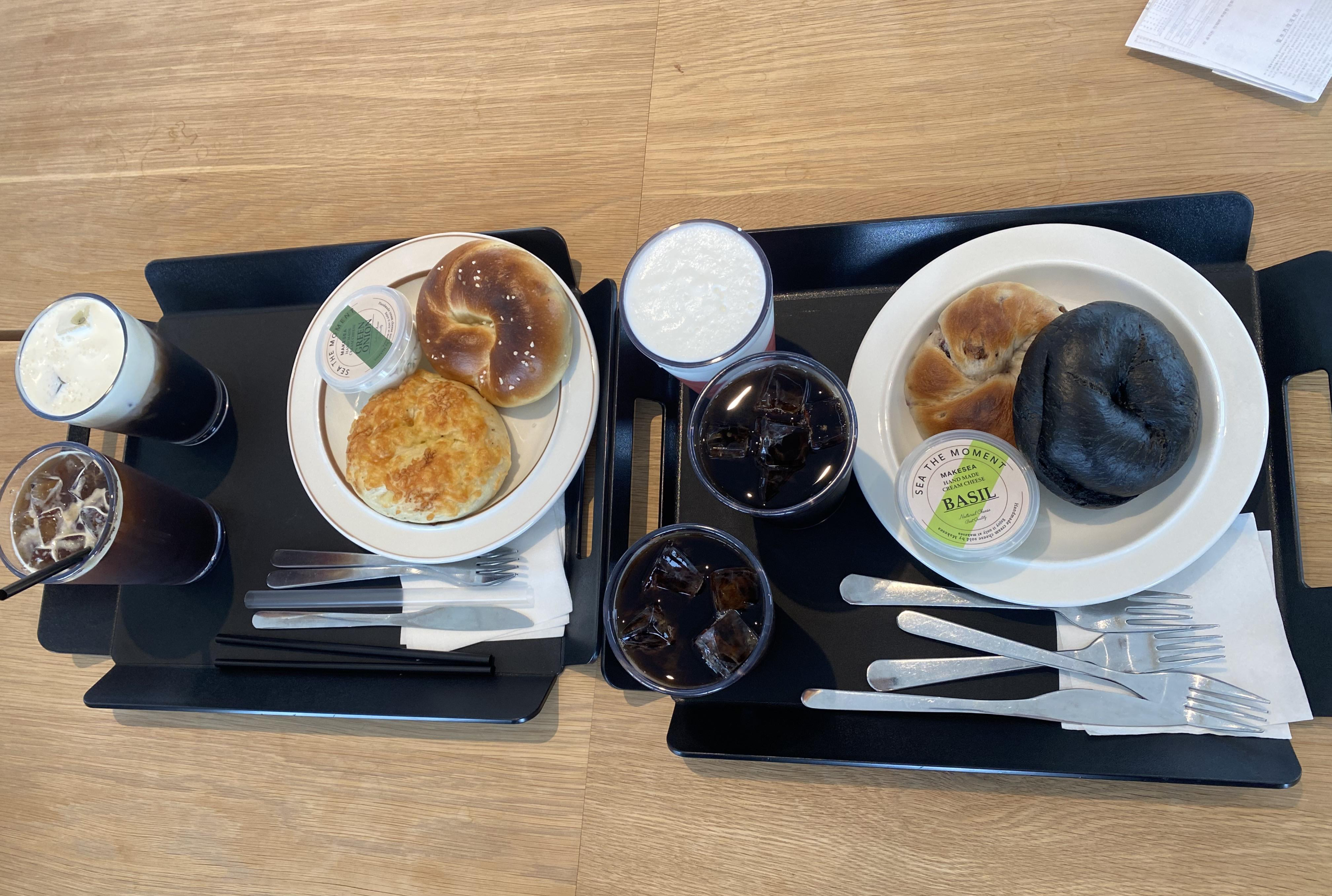 저희가 주문한 음료와 베이글입니다. 음료는 콜드브루와 씨솔트슈페너를 주문했어요. 그리고 베이글은 시오(소금), 감자치즈, 호두크랜베리, 블랙허니버터를 주문했습니다.