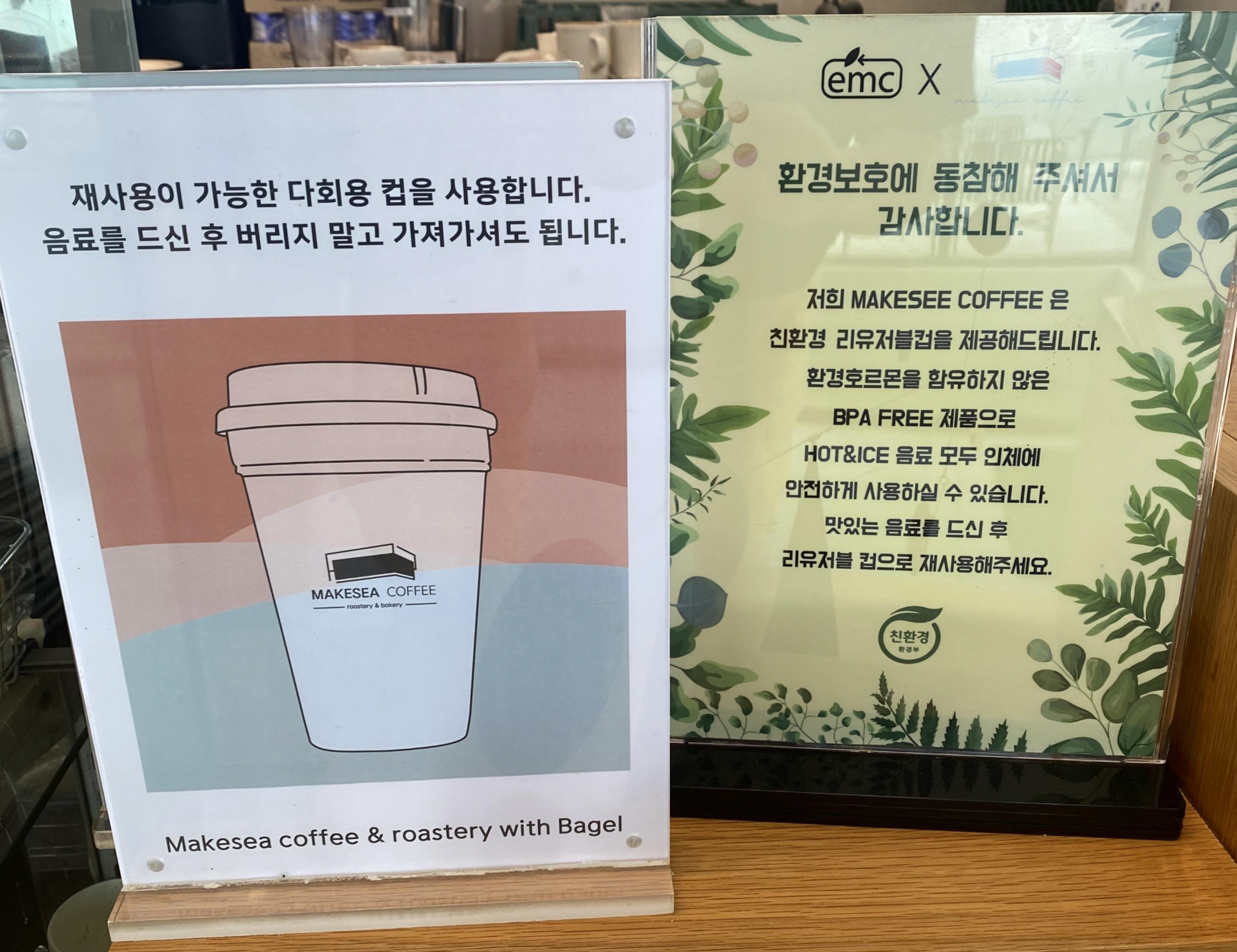 '메이크씨'에서는 재사용이 가능한 다회용 컵 즉, 리유저블컵을 사용한다고 합니다. 때문에 음료를 다 먹은 후에 버리지 않고 가져가서 추후에 재활용하여 쓸 수 있어요.