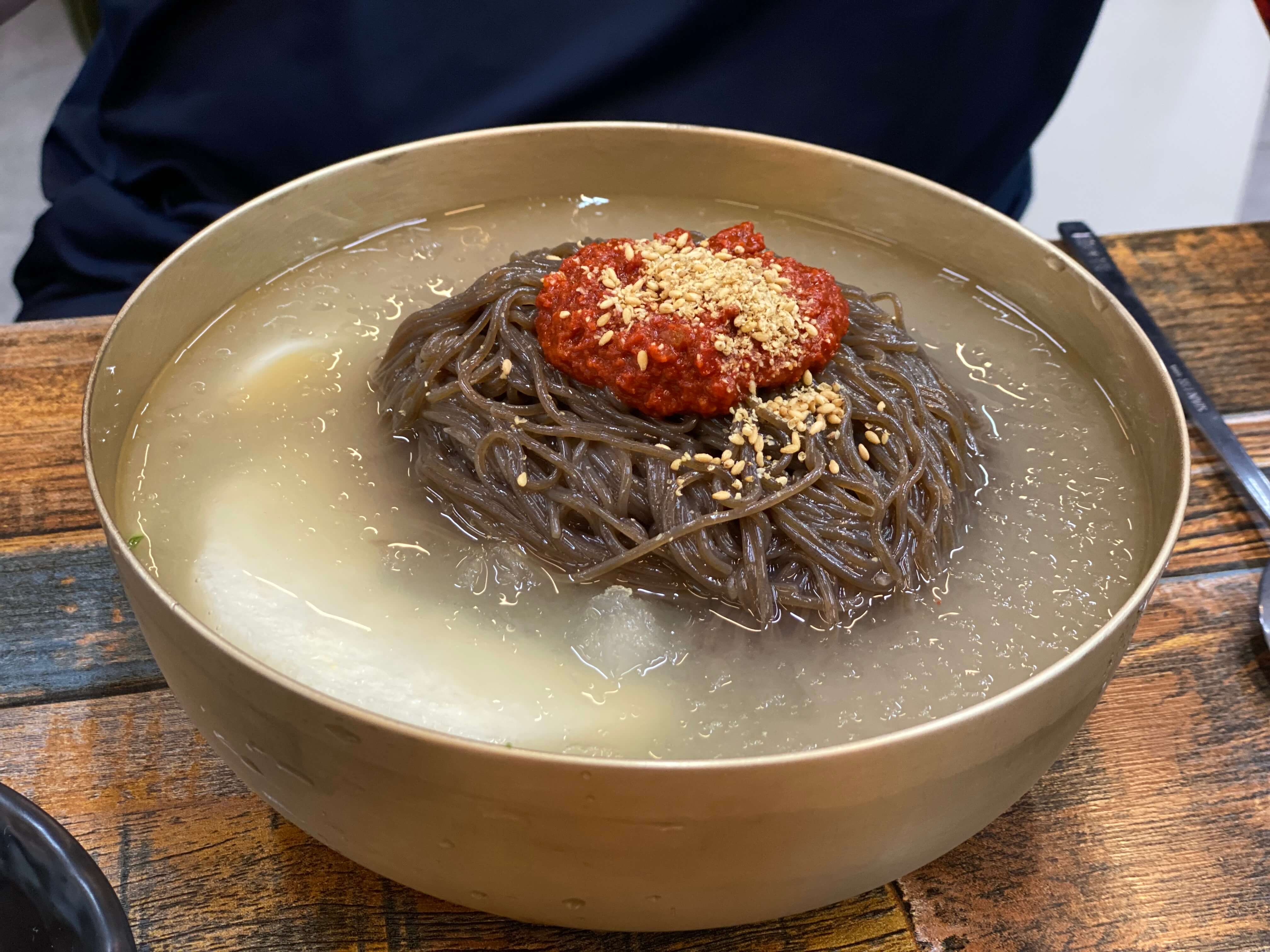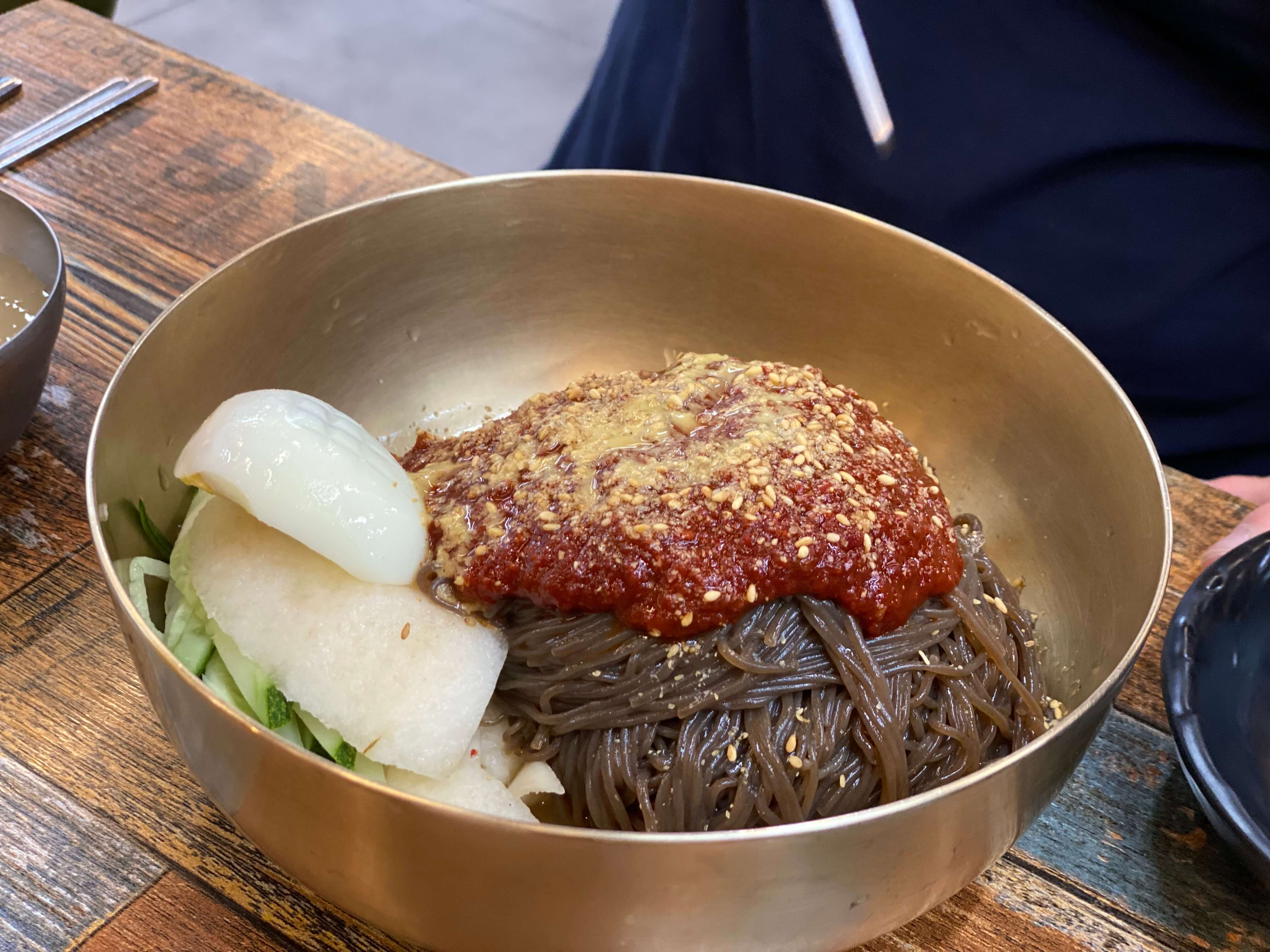 저희 엄마의 원픽입니다. 빨간 양념 위로 고소한 참깨가 올라가서 참깨의 풍미까지 놓치지 않은 비빔냉면이에요. 무에 싸서 먹으면 그 맛 아는 사람이라면 참기 힘들어요. 놋그릇 마저 시원하게 나와서 비빔냉면이지만 끝까지 시원하면서도 매콤 달콤하게 즐길 수 있어서 좋았어요.