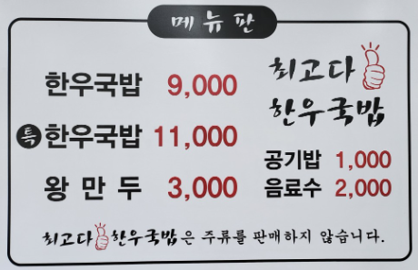 최고다 한우국밥의 한우국밥은 9천원입니다. 한우가 들어갔음에도 1만원이 안 되는 건 사실상... 사장님의 신념이지 않을까 싶어요. 이제는 돼지 국밥도 1만원 시대이니깐요.