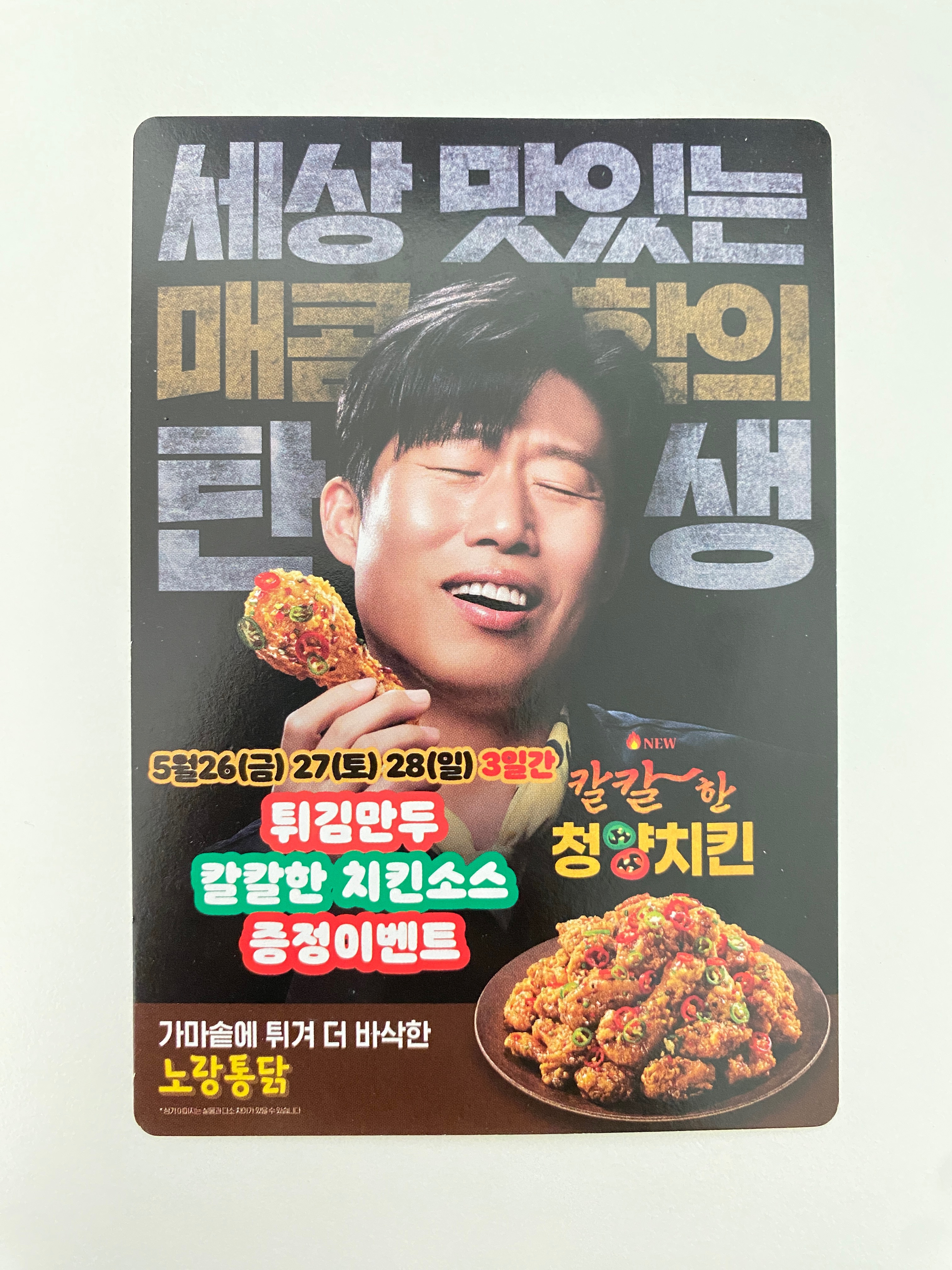 오늘은 신메뉴 '칼칼한 청양치킨'이 출시된 노랑통닭 리뷰를 진심을 담아 해보려고 합니다. 얼마 전 저희 집 현관문에 작은 전단지 하나가 붙여져 있었는데 바로 노랑통닭 전단지였어요. 평소에는 보지도 않고 버리는 데 모델이 치킨을 들고 얼마나 맛있는 표정을 짓고 있는지 버릴 수가 없어 봤어요. 그 모델이 바로 유해진입니다. 위에 보이는 사진들 중 오른쪽 사진이 제가 받았던 미니 전단지인데요. 어떻습니까? 여러분도 저처럼 청양치킨이 너무 궁금해지지 않으시나요? 노랑통닭의 칼칼한 청양키친은 4월 27일에 출시한 이후로 약 25일 만에 누적판매 10만 개를 달성할 만큼 인기가 상당하다고 합니다.