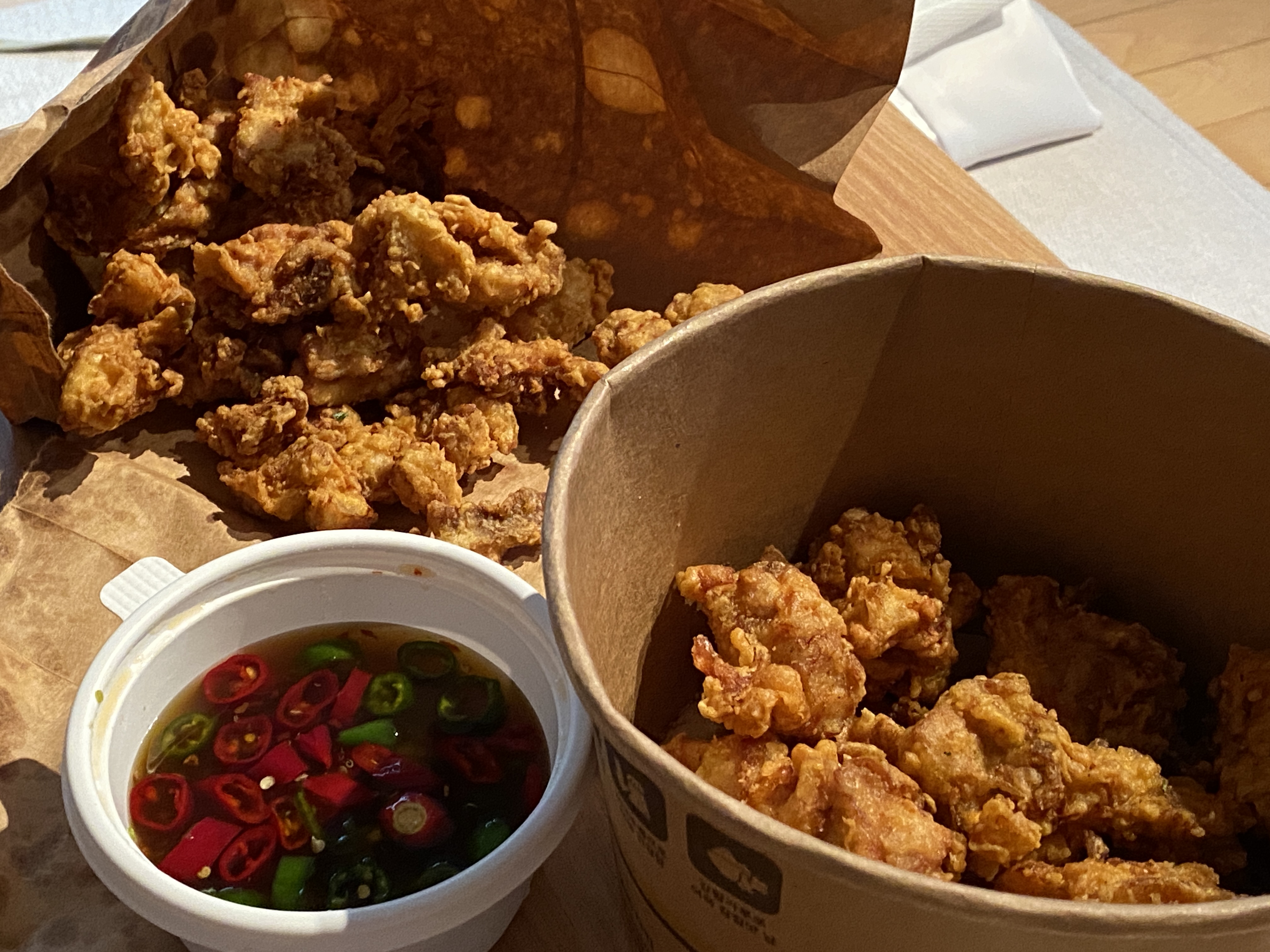 피시 소스가 생각나는 청양 소스가 노랑 통닭과 아주 잘 어우러져서 이색적이었는데 거부감은 전혀 들지 않는 맛이었습니다.