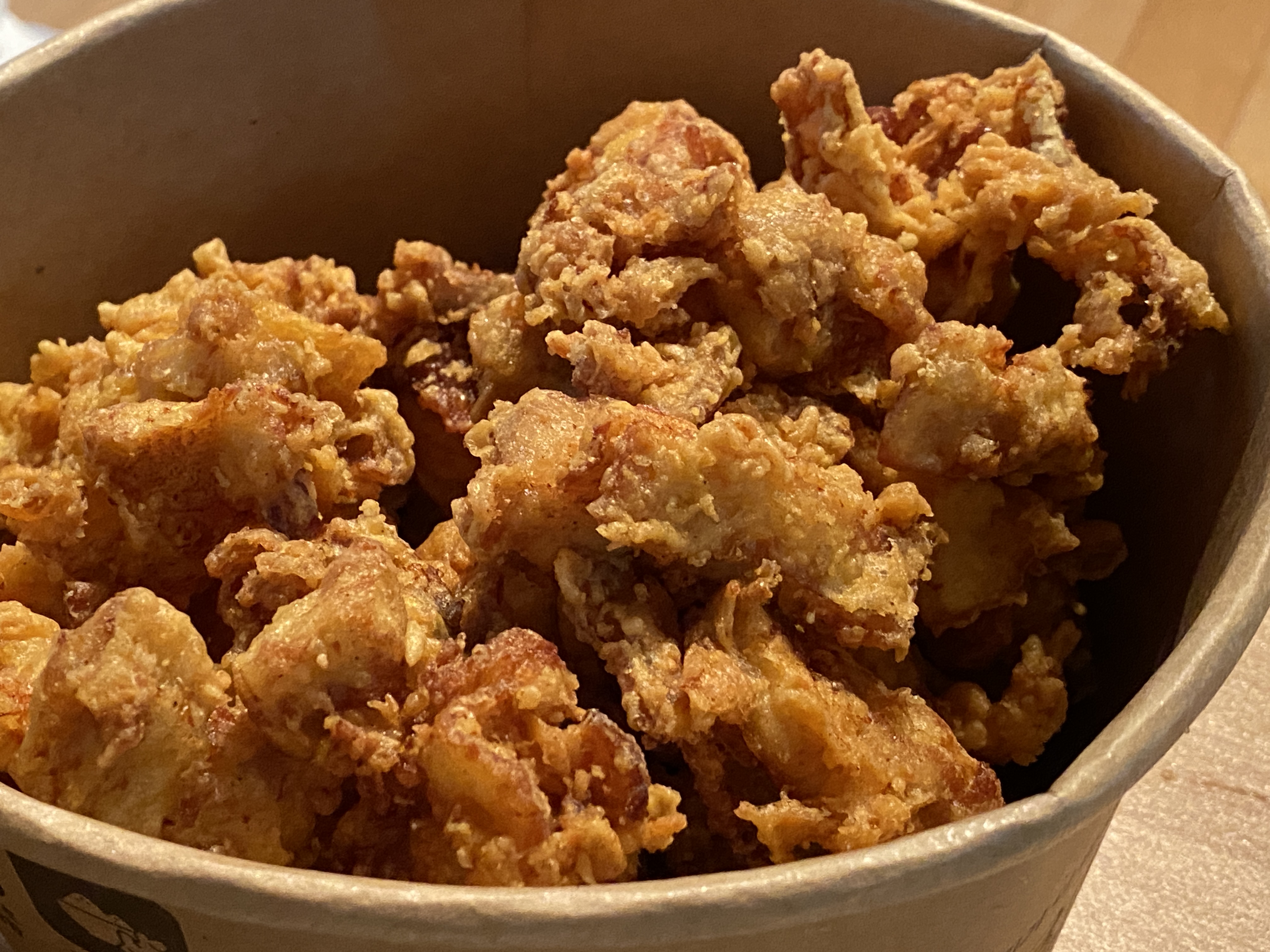 제일 처음 치킨을 받아올 때에는 치킨을 종이봉투에 넣은 상태로 종이 원통 그릇에 한 번 더 넣은 포장으로 주십니다. 설명을 읽어보니 사진처럼 치킨을 종이 원통에 넣은 다음 소스를 부어 부먹해먹거나 또는 찍먹해먹는 방식으로 취향껏 즐기면 된다고 합니다.