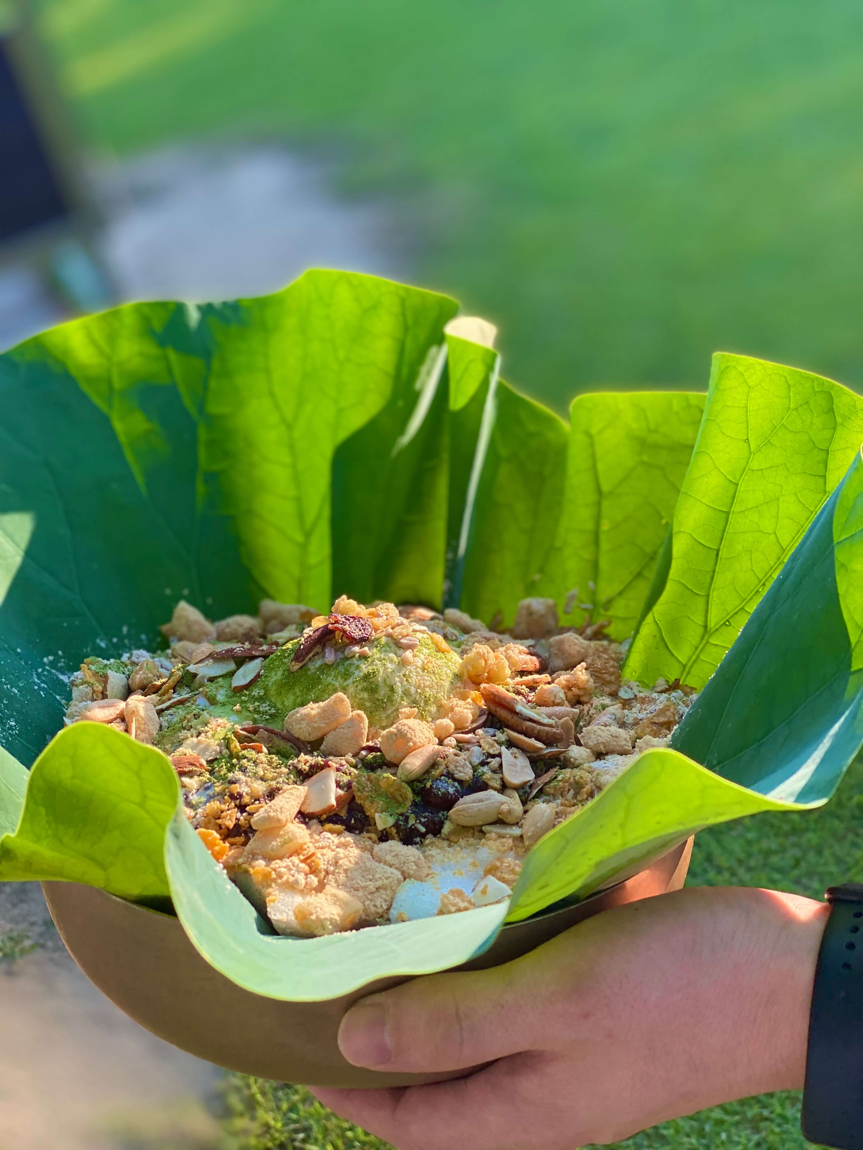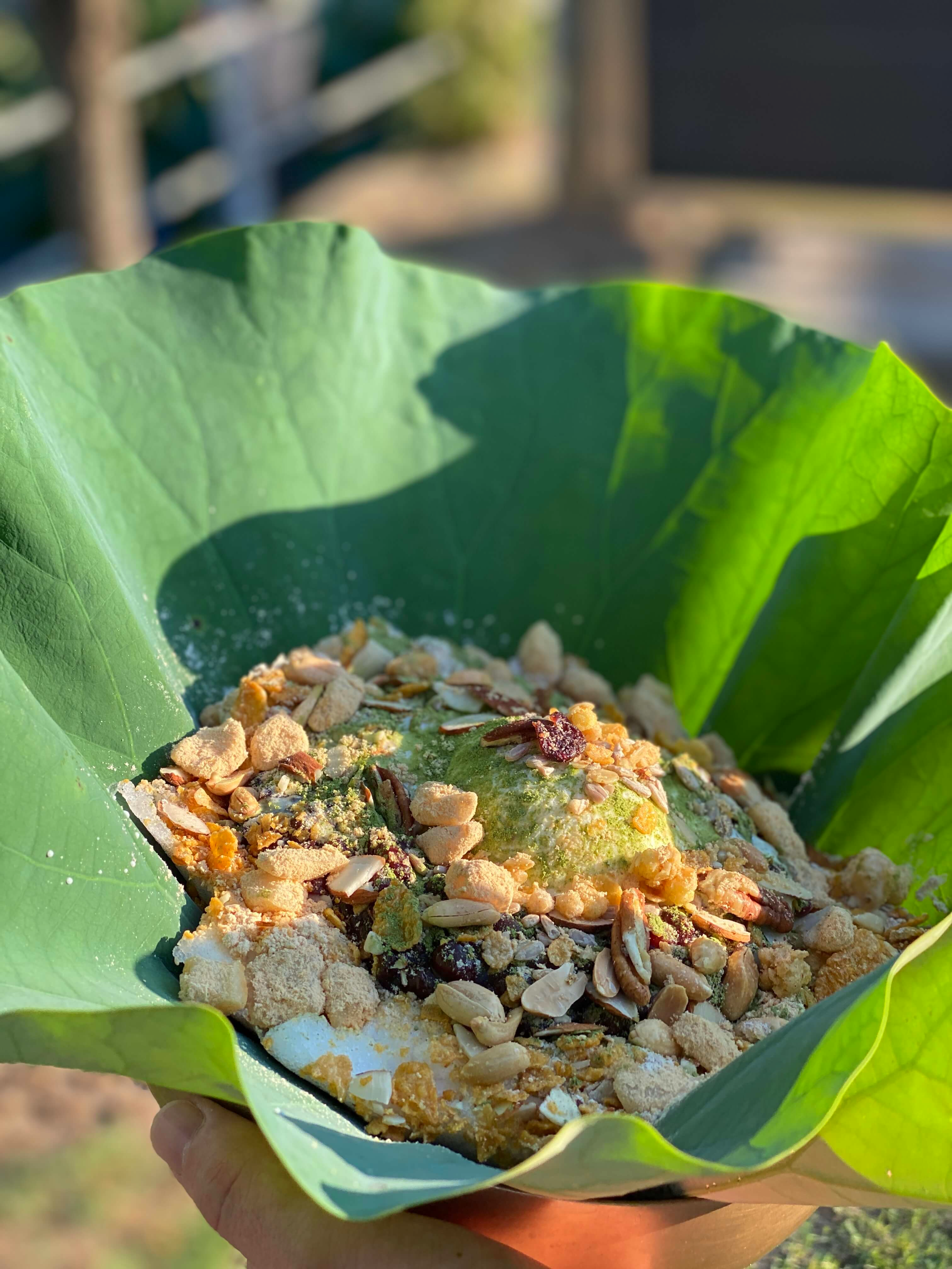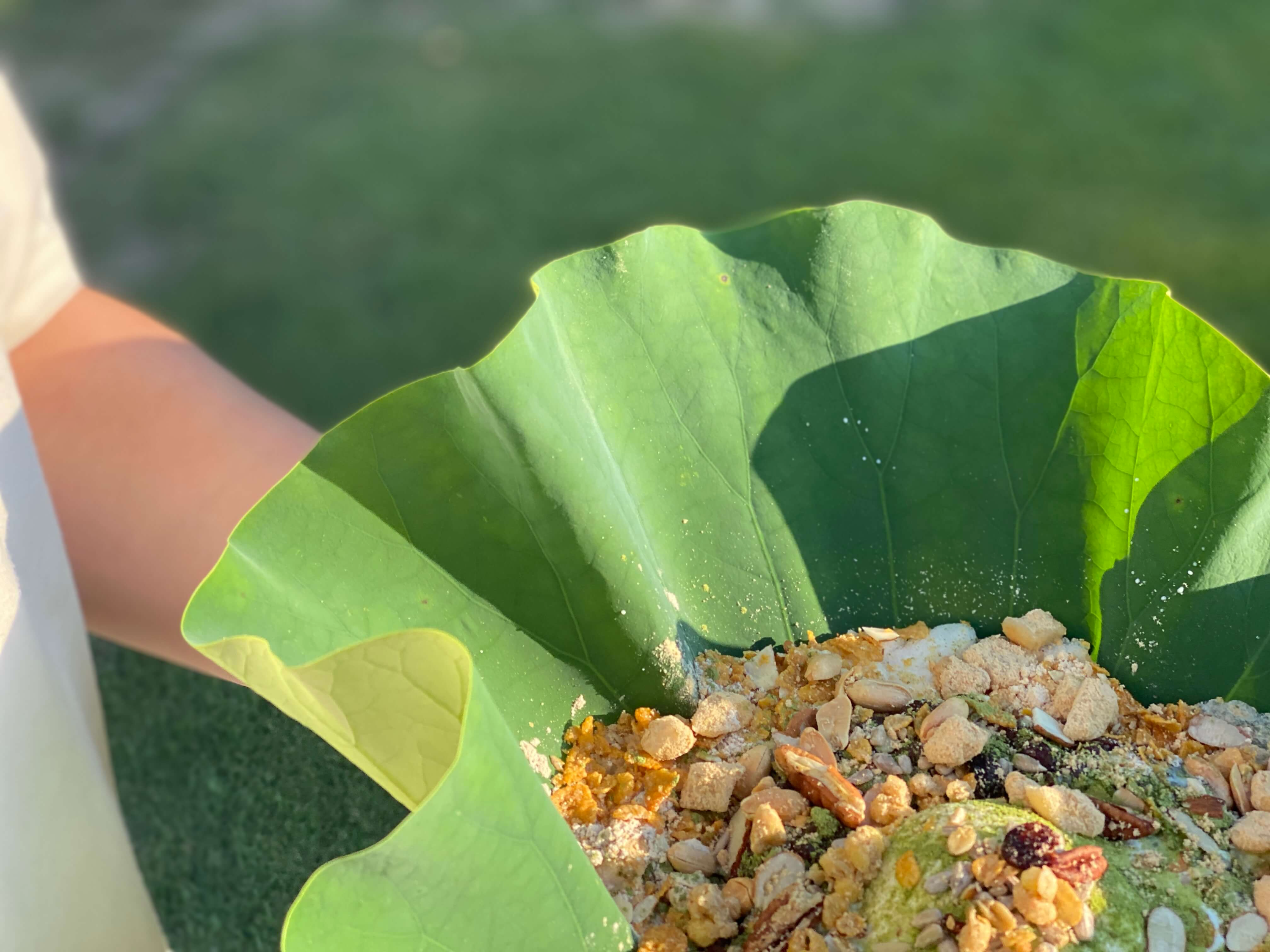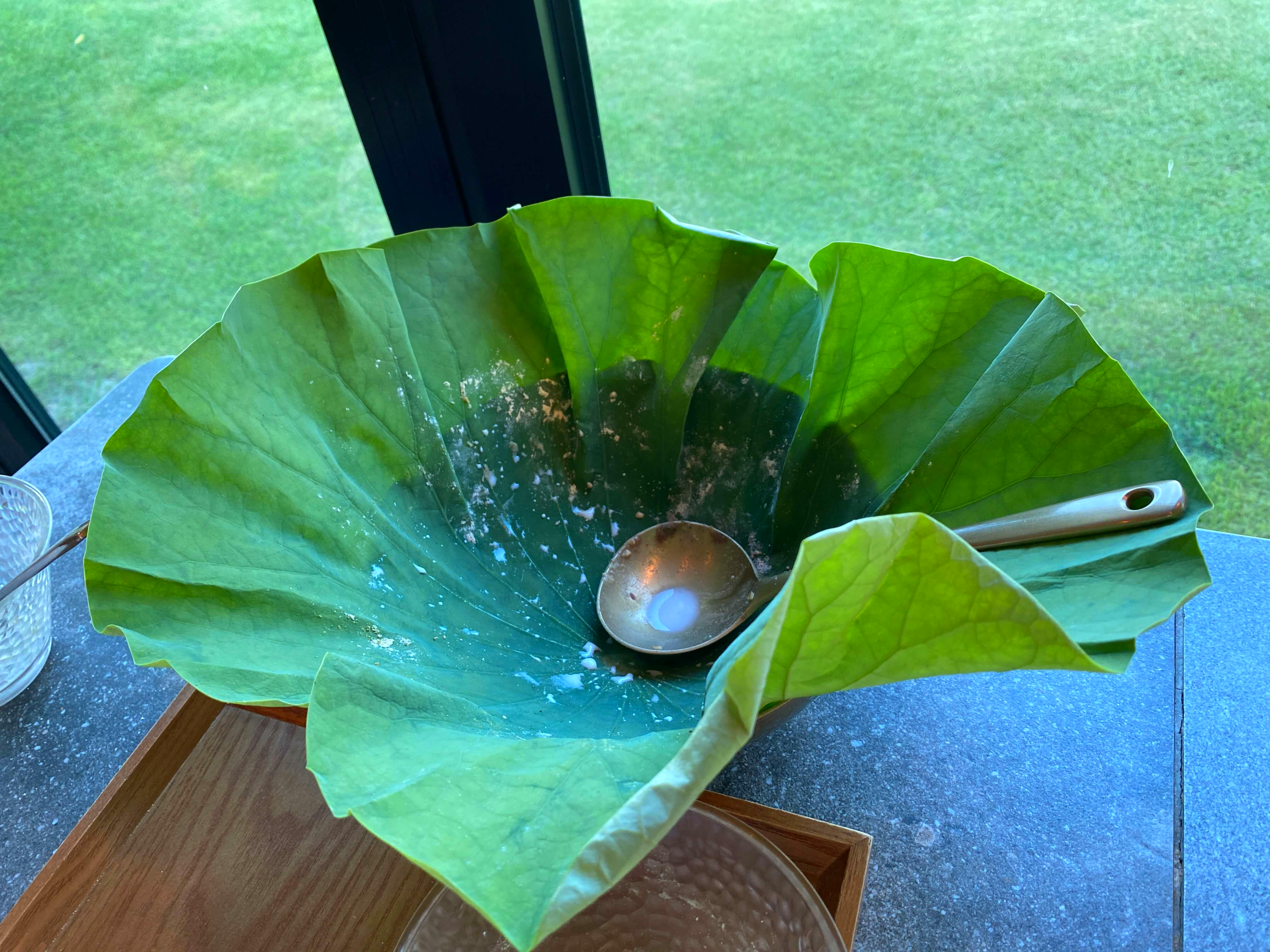 그리고 꽃뫼카페휴게소 사장님의 센스가 정말 대단하다고 생각했던 부분이 바로 연잎을 그릇으로 사용하실 생각을 했다는 점이었어요. 연잎 특성상 팥빙수가 녹으면서 생기는 물들이 연잎 덕분에 아주 깔끔하게 연잎 가운데로 모여지더라고요.