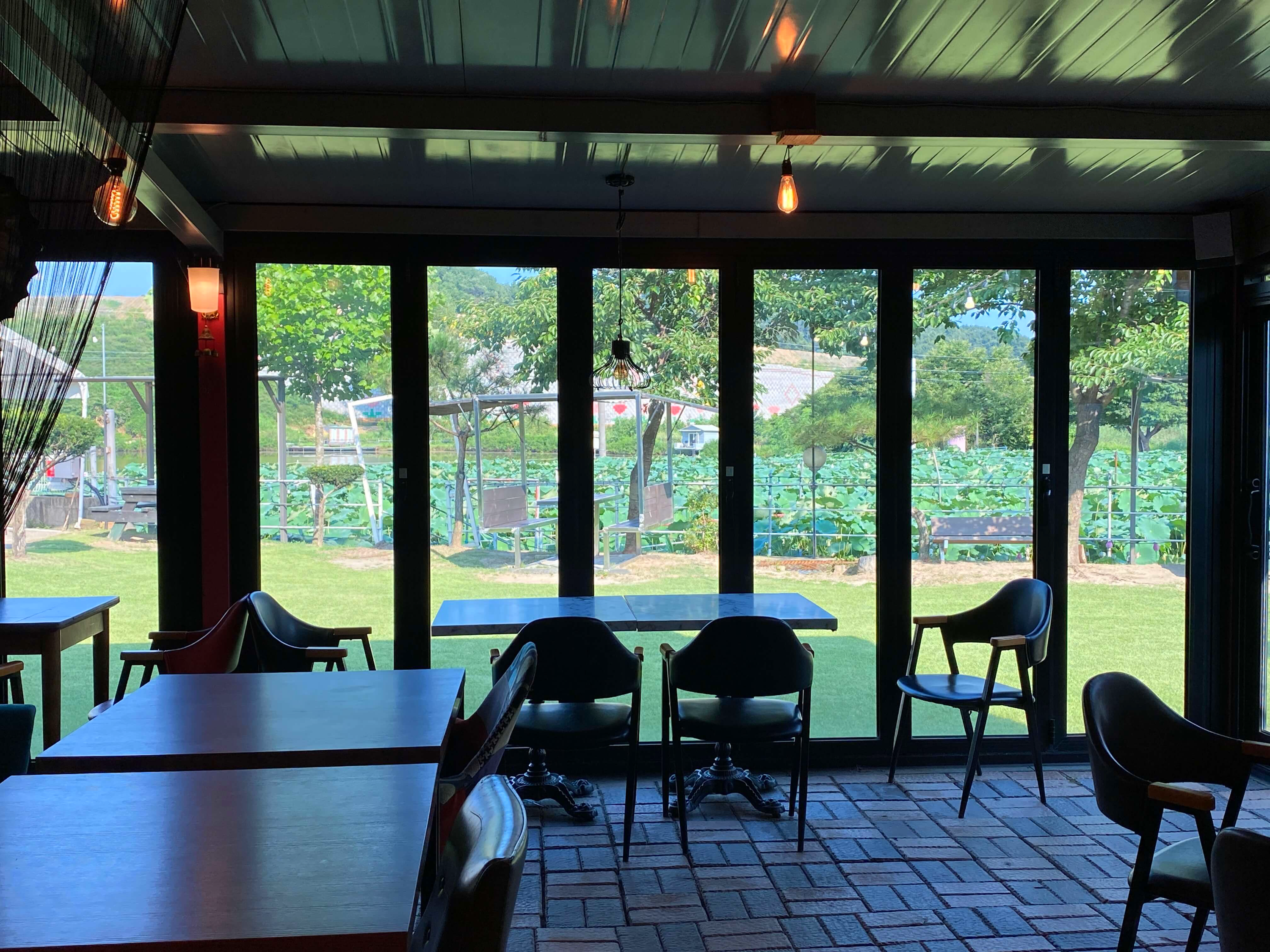 꽃뫼카페휴게소의 건물 외관은 다소 투박하게 생겼어요. 하지만 내부에서 바라보는 바깥 풍경은 연두빛 가득한 잔디밭과 초록빛 가득한 연잎들로 바라보는 것 그 자체가 힐링입니다.