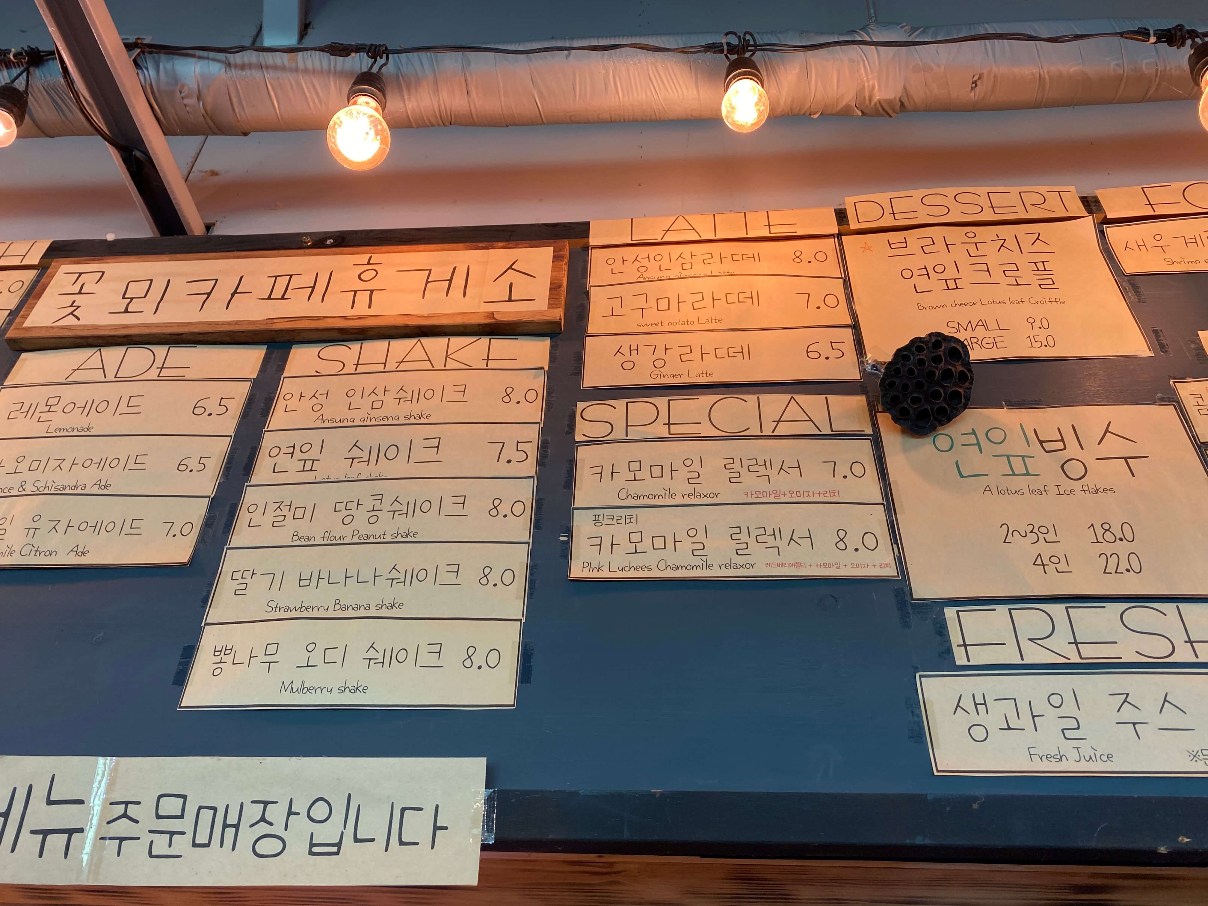 이 외에도 다양한 커피 메뉴들이 있습니다. 저희는 처음부터 연잎빙수를 먹으러 간 거라 고민없이 연잎빙수를 주문했어요. 그리고 꽃뫼카페휴게소에 온 만큼 연잎차도 하나 주문했습니다.