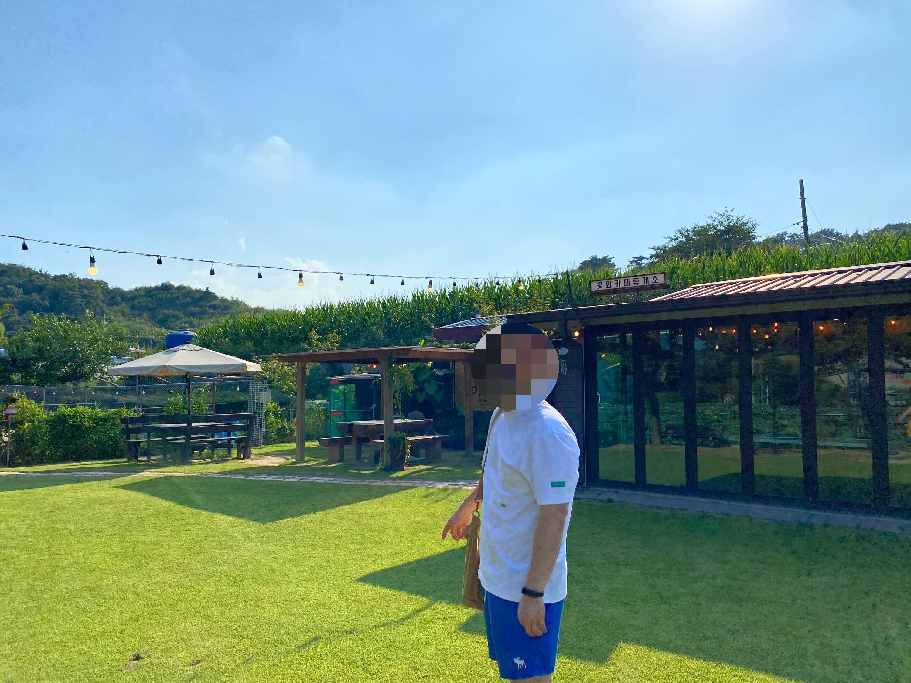 연두 연두한 넓은 잔디밭이 예쁜 꽃뫼카페휴게소입니다. 햇빛 밭으면 잔디밭에서 빛이 나는 거 같아요.