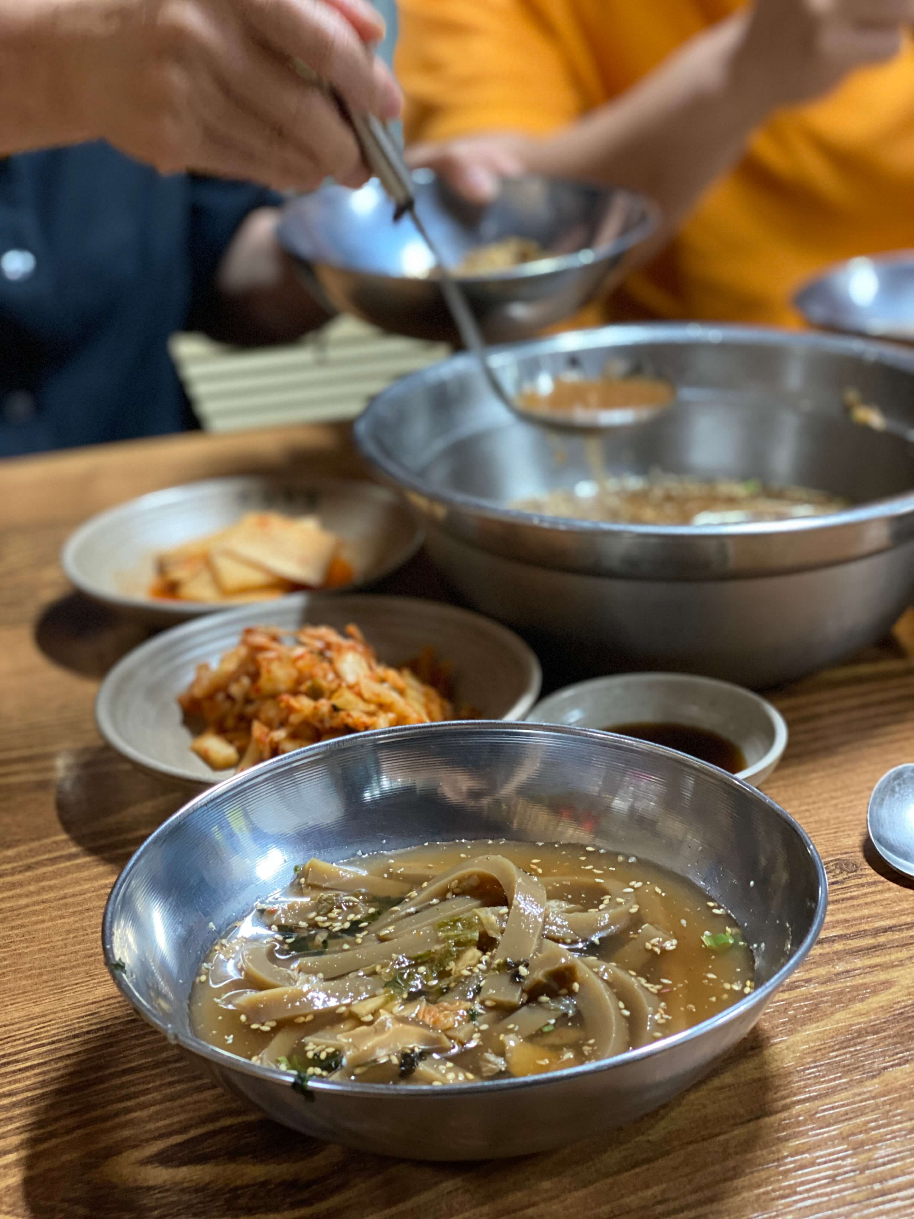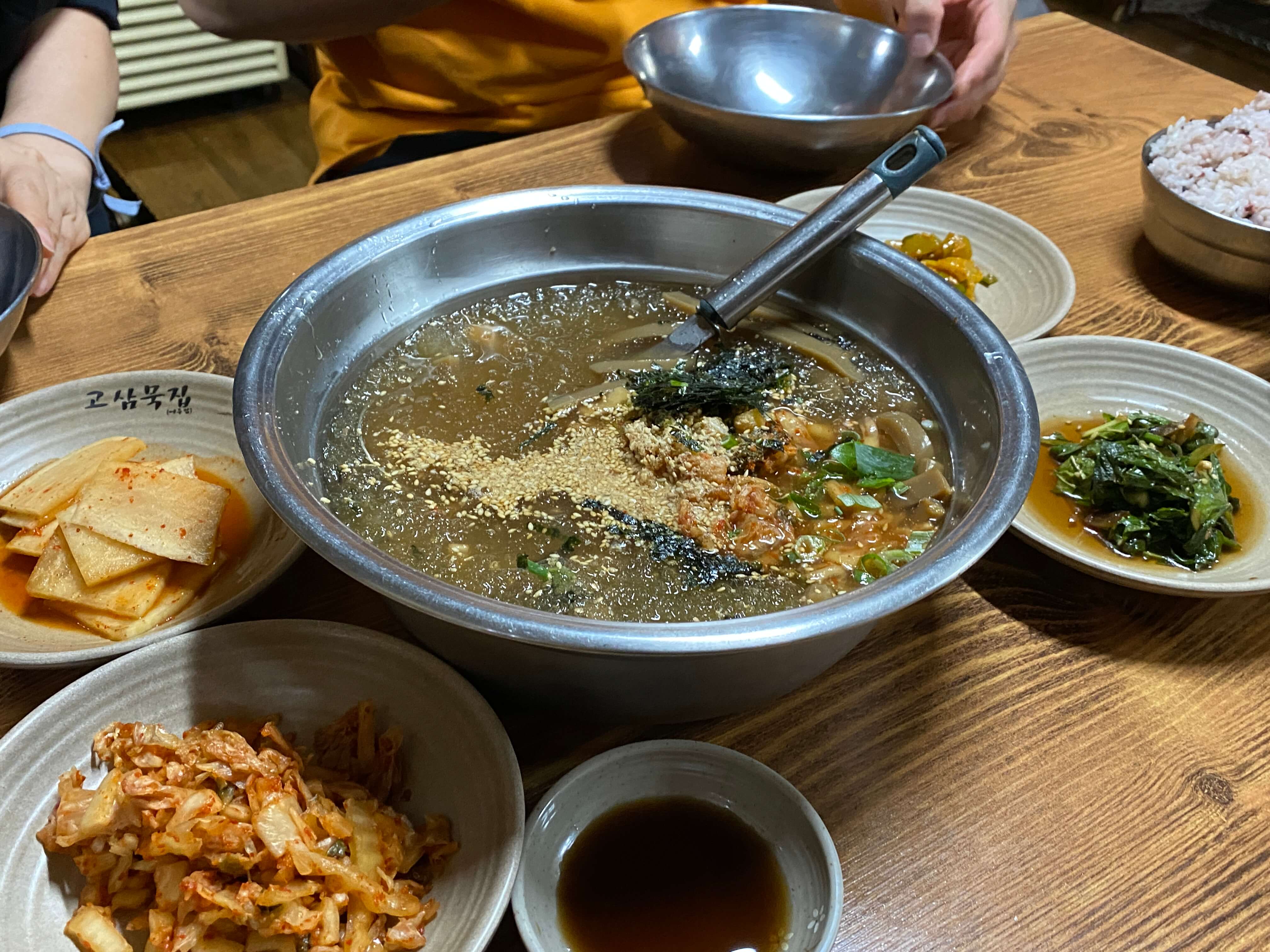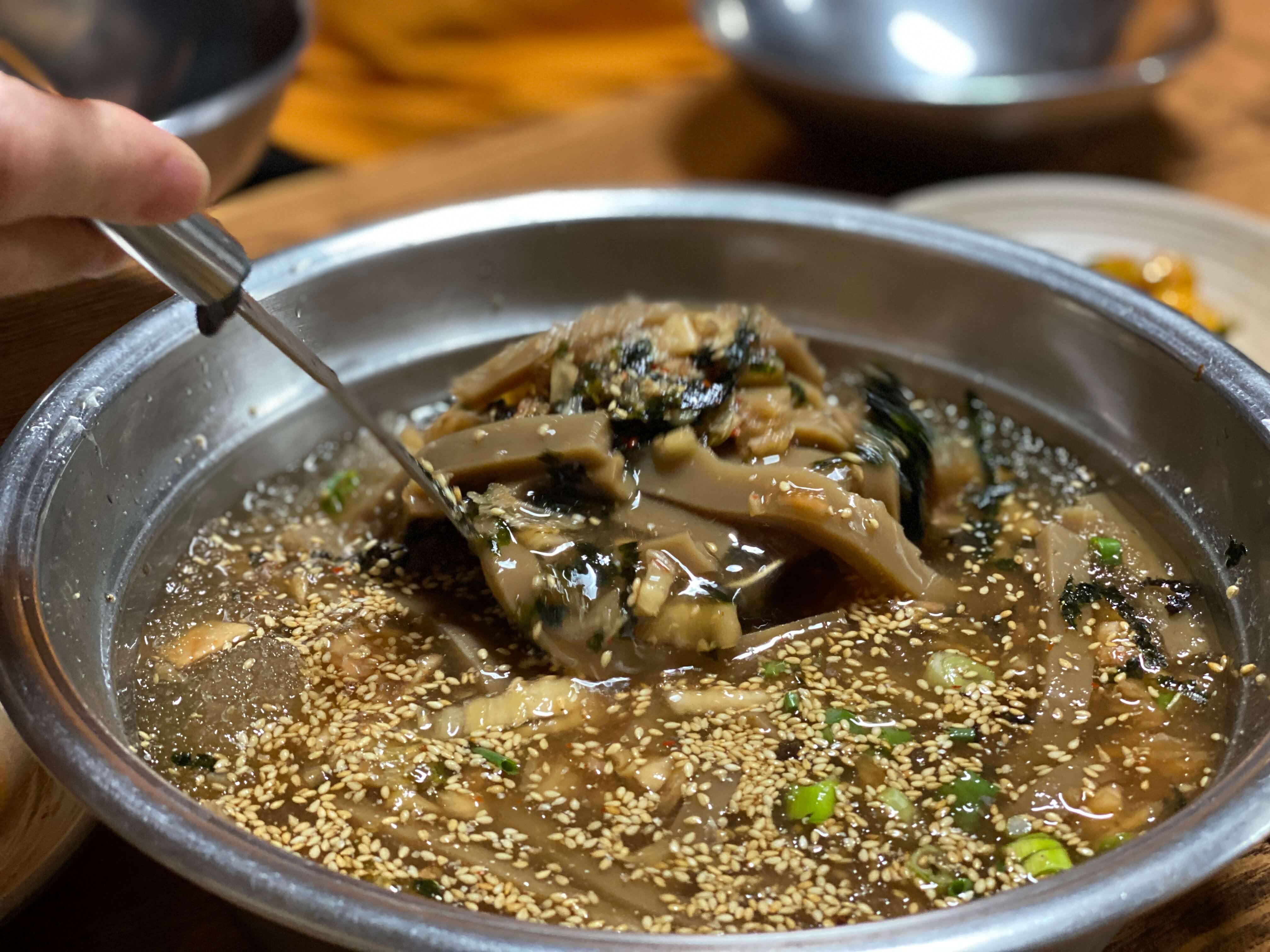 순식간에 제 입맛을 매료시킬만큼 육수의 맛이 풍부해서 정말 맛있게 먹었습니다. 김치를 넣고 덜 넣고의 차이에 따라 간을 맞출 수가 있어서 개개인의 입맛에 맞게 간을 맞춰가며 먹었습니다. 묵도 직접 쑤시는 거라 그런지 정말 탱탱하고 식감이 좋았어요. 자잘하게 씹히는 깨마저 고소하니 정말 맛있었습니다.