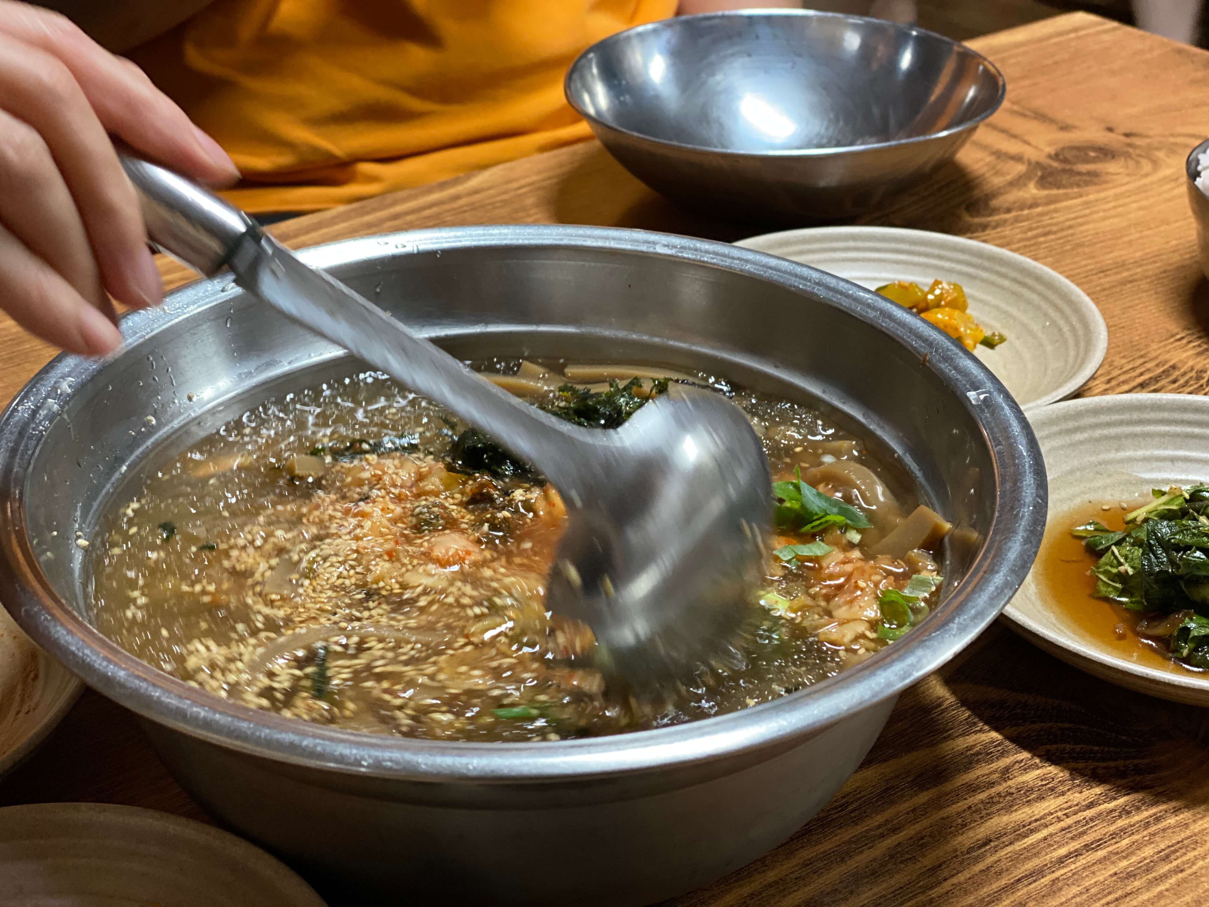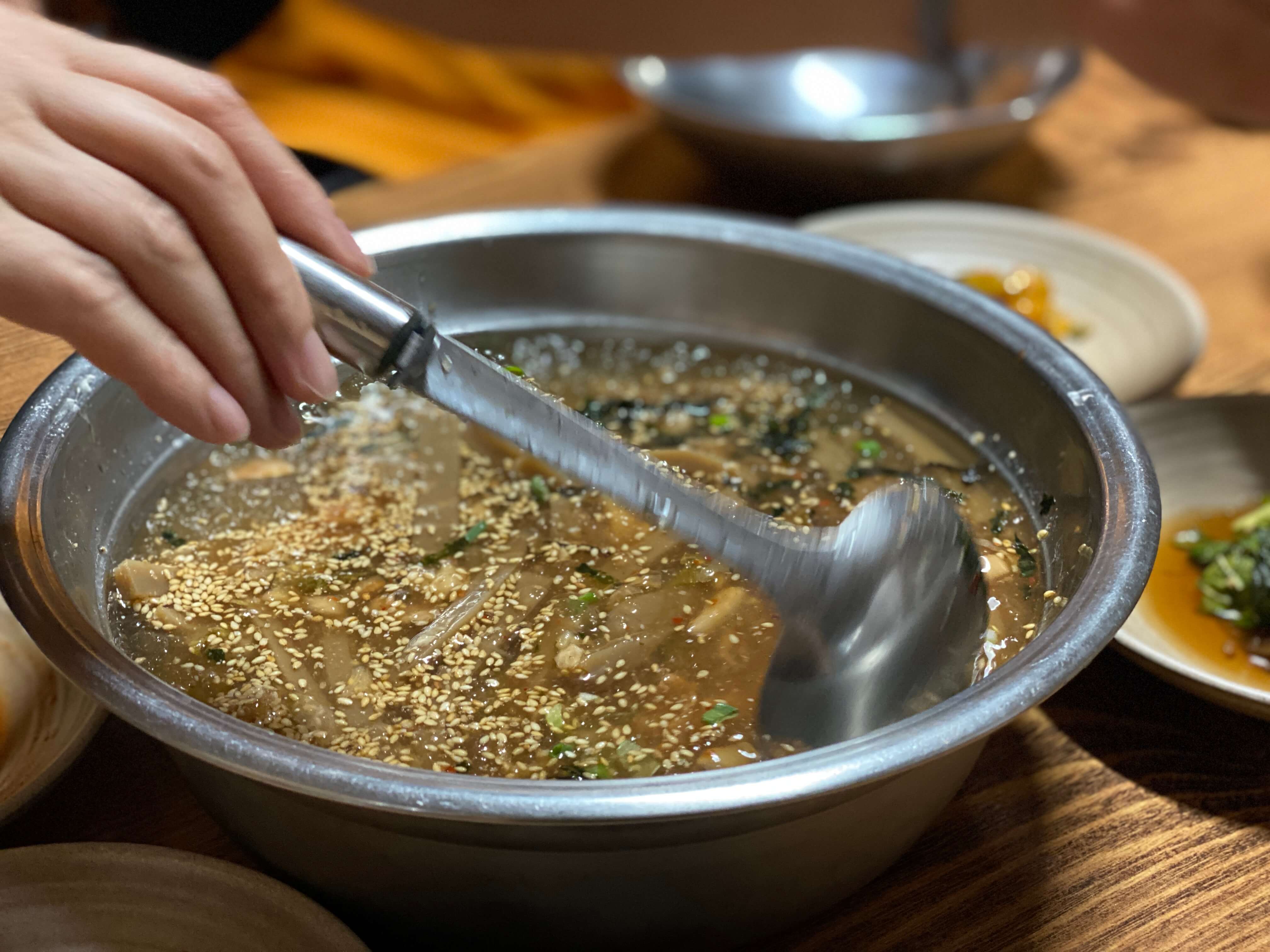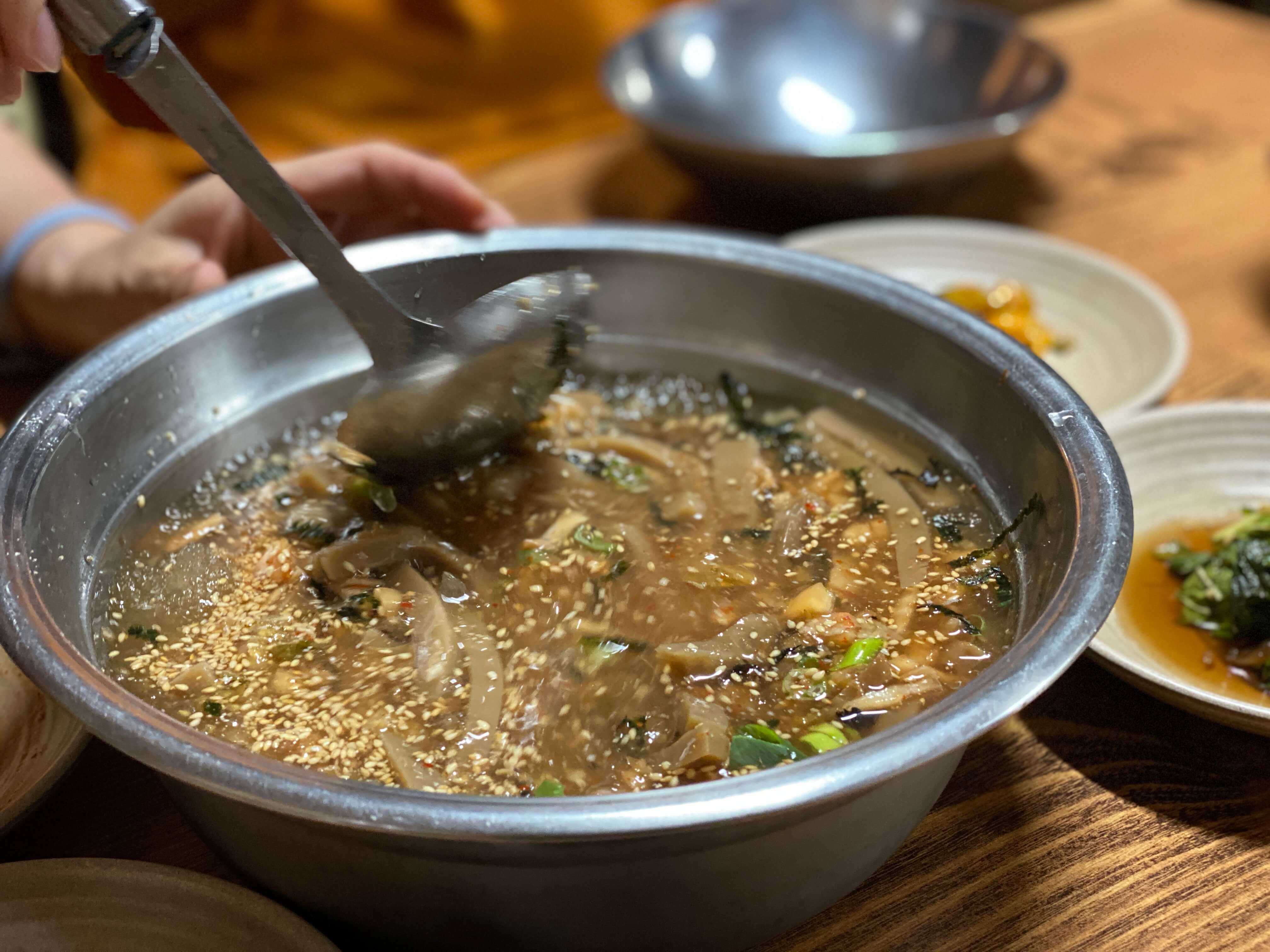 순식간에 제 입맛을 매료시킬만큼 육수의 맛이 풍부해서 정말 맛있게 먹었습니다. 김치를 넣고 덜 넣고의 차이에 따라 간을 맞출 수가 있어서 개개인의 입맛에 맞게 간을 맞춰가며 먹었습니다. 묵도 직접 쑤시는 거라 그런지 정말 탱탱하고 식감이 좋았어요. 자잘하게 씹히는 깨마저 고소하니 정말 맛있었습니다.