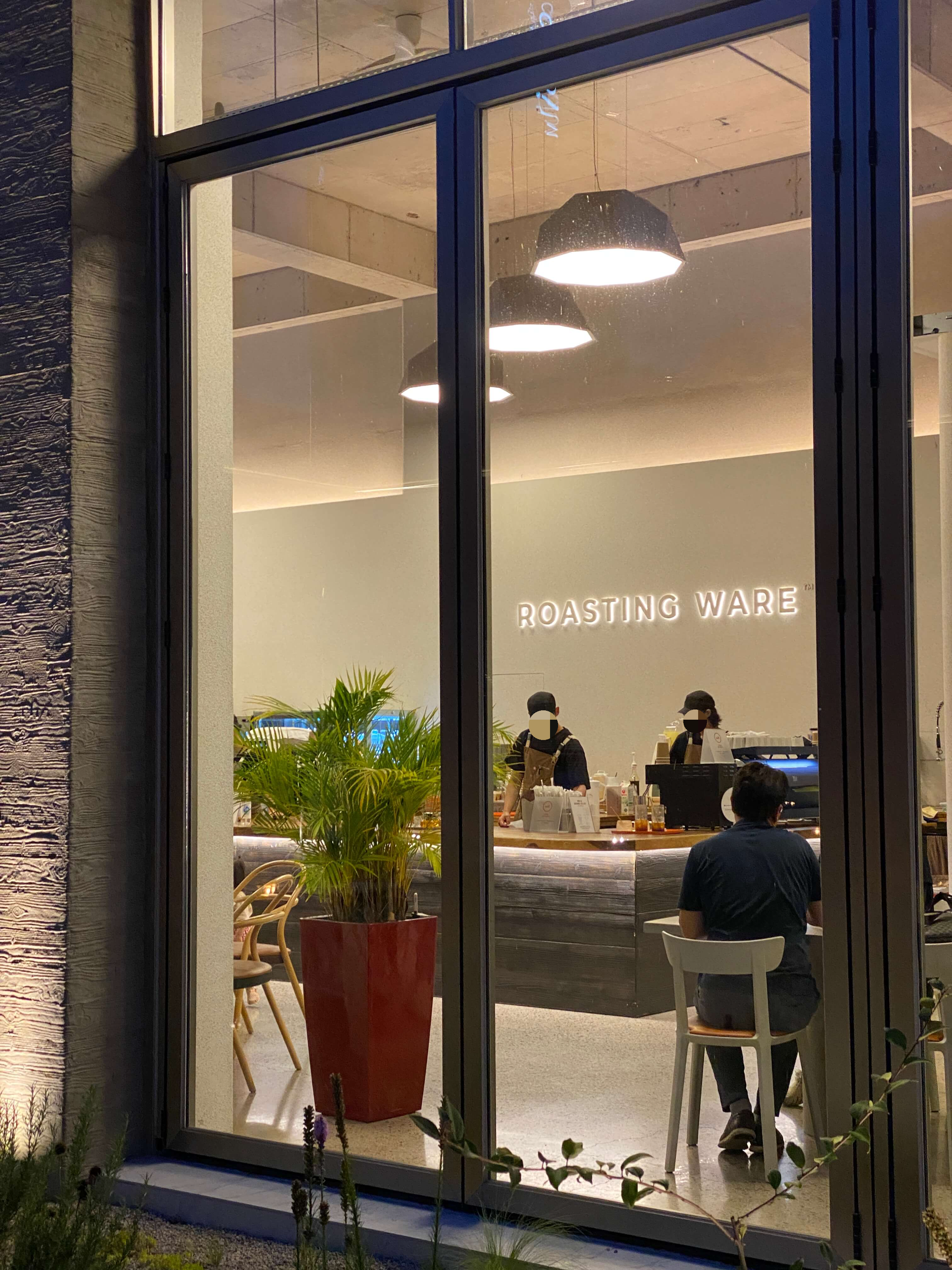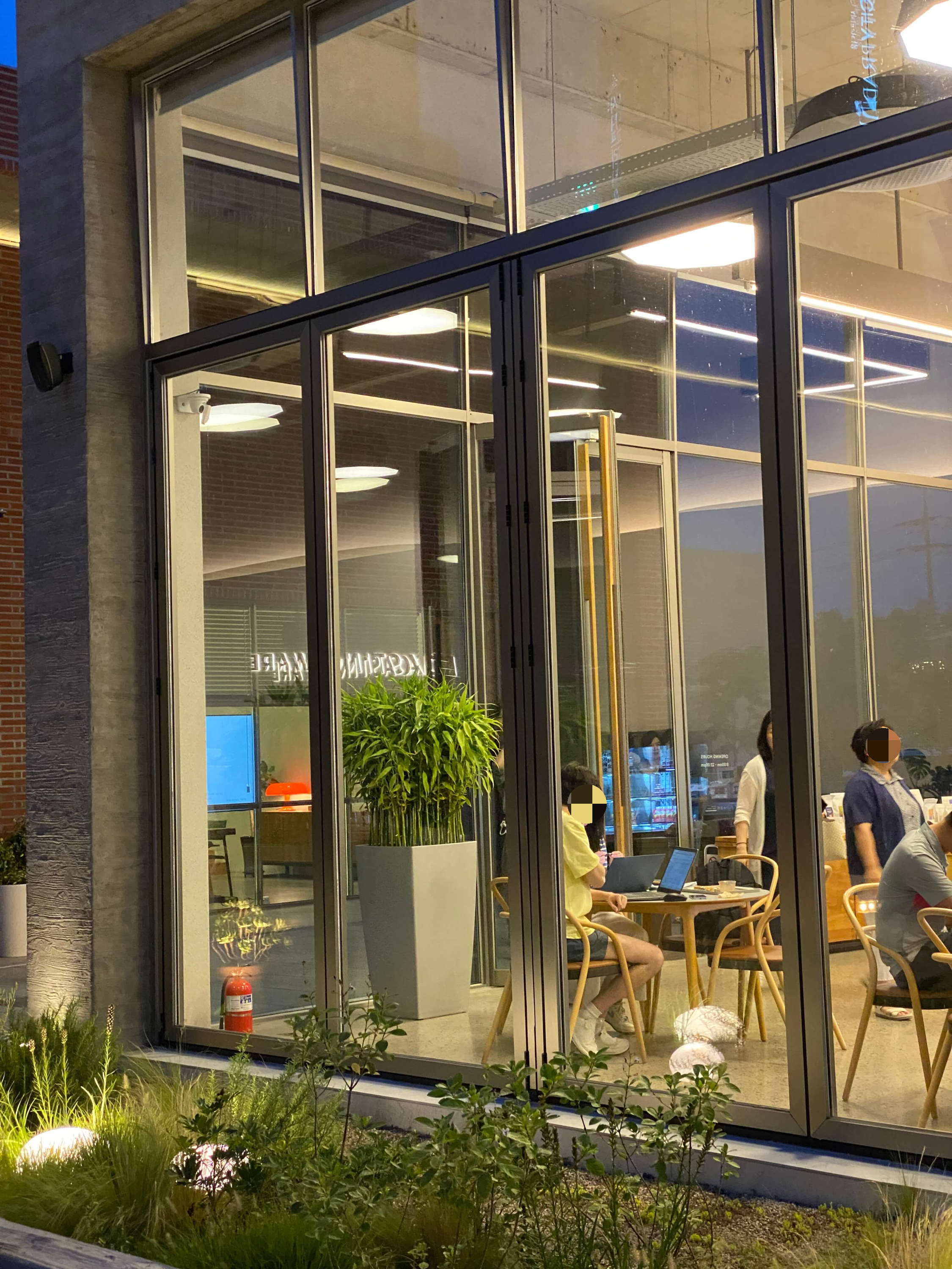 밖에서 바라보는 로스팅웨어 카페 내부의 모습도 예뻐보였어요. 아무렴 층고가 높아서 답답해 보이지도 않고 조명도 은은하니 분위기가 좋았어요. 아직까지는 아무래도 실내가 훨씬 쾌적하고 시원했어요.