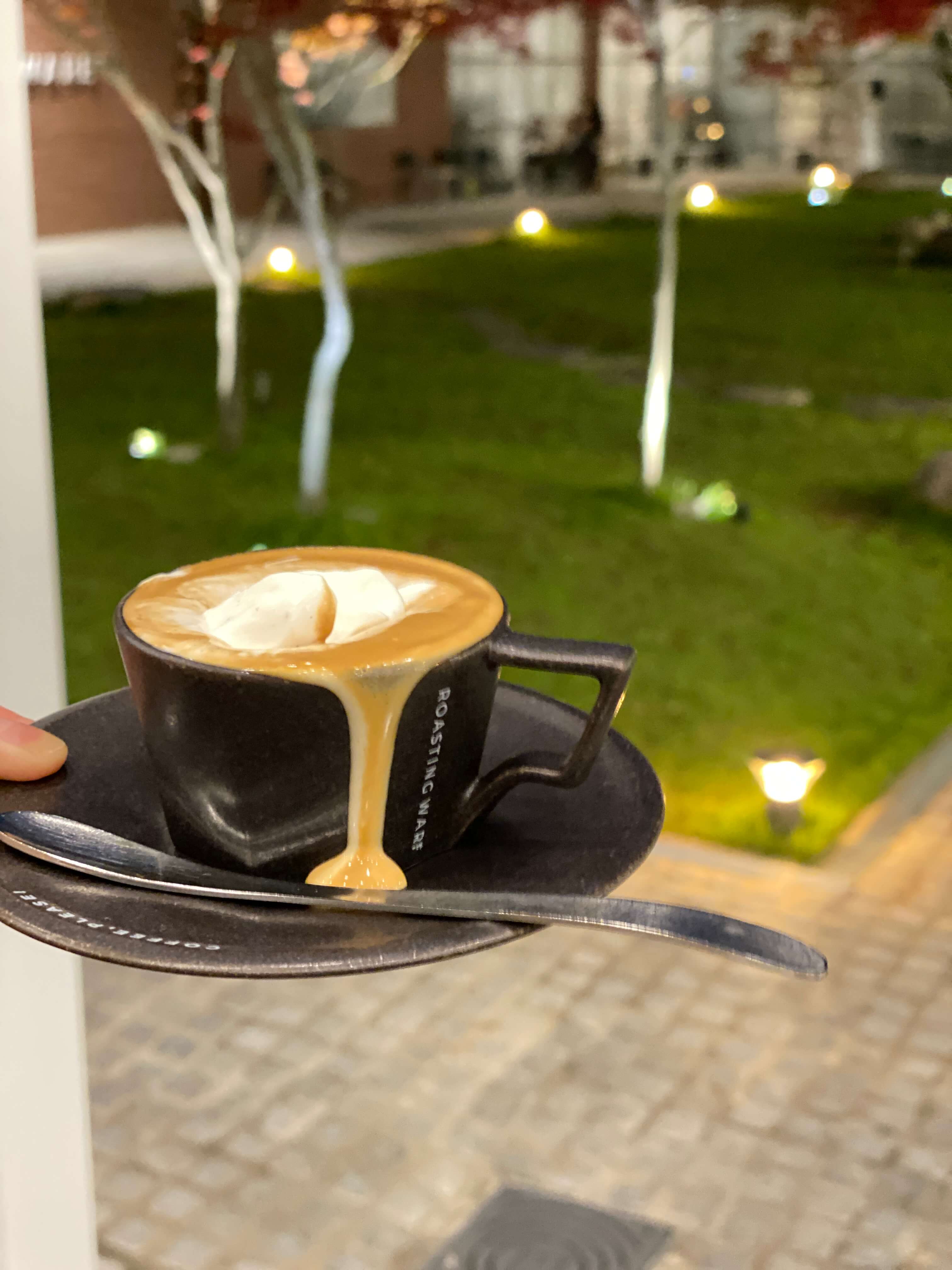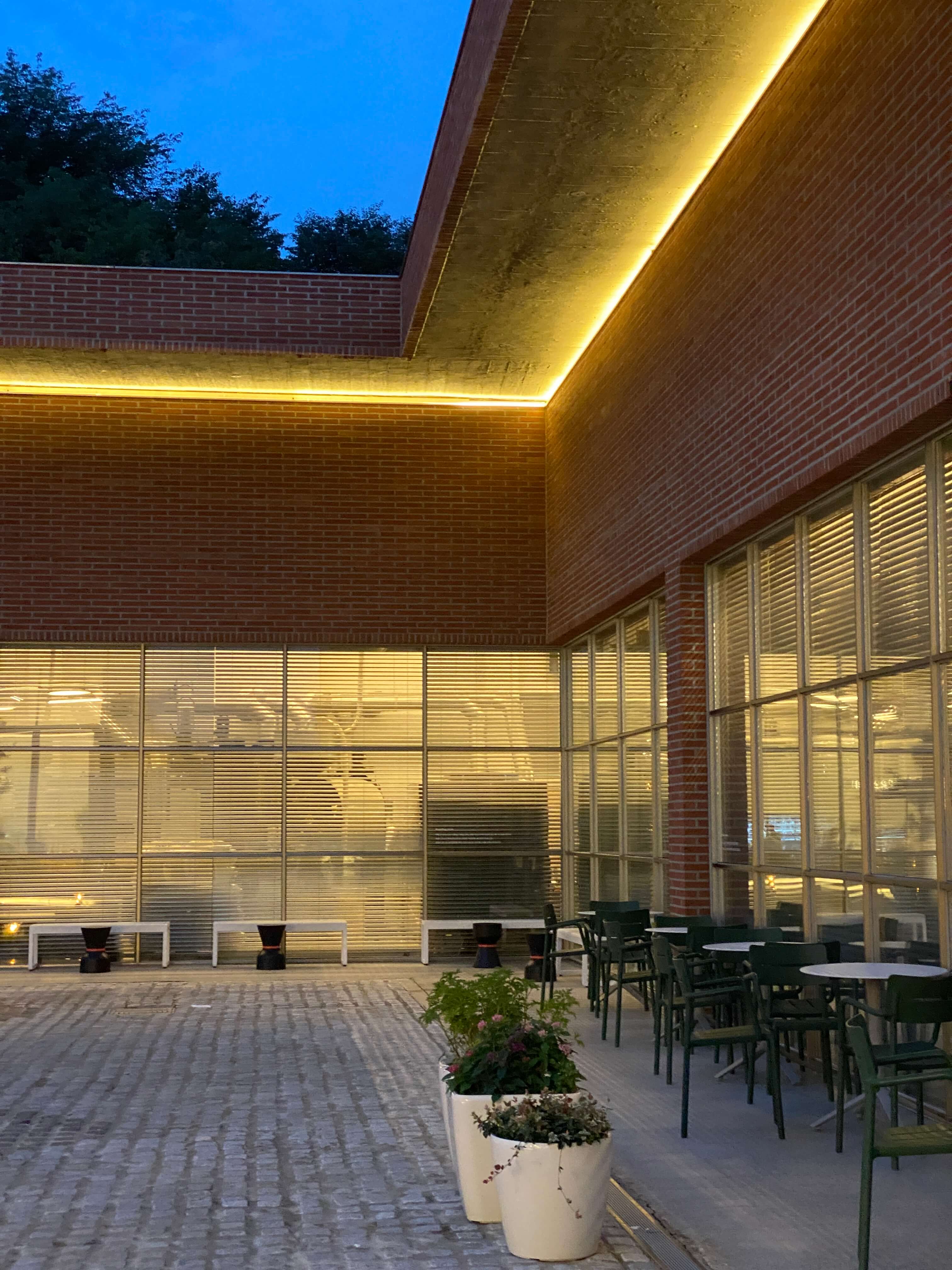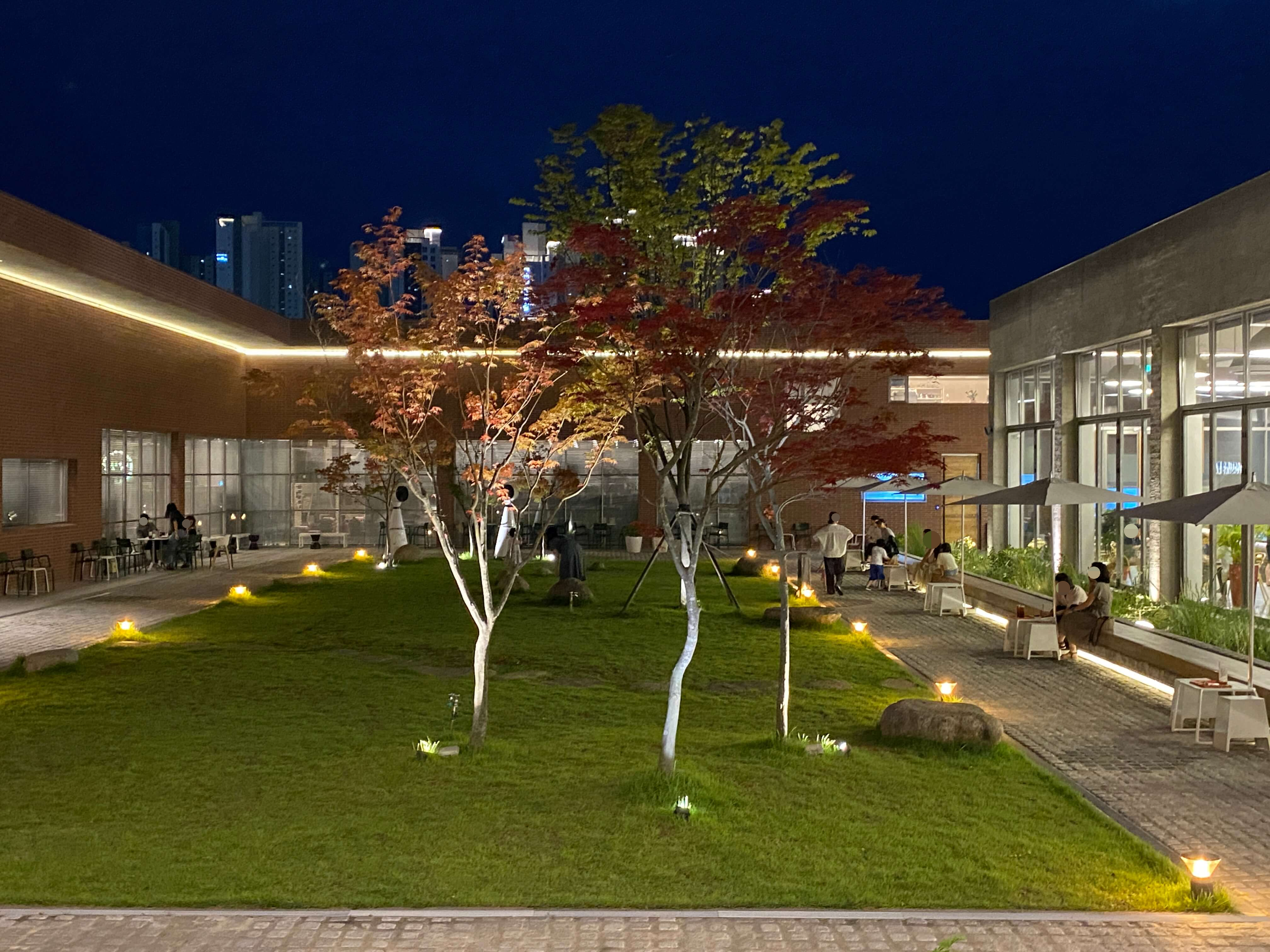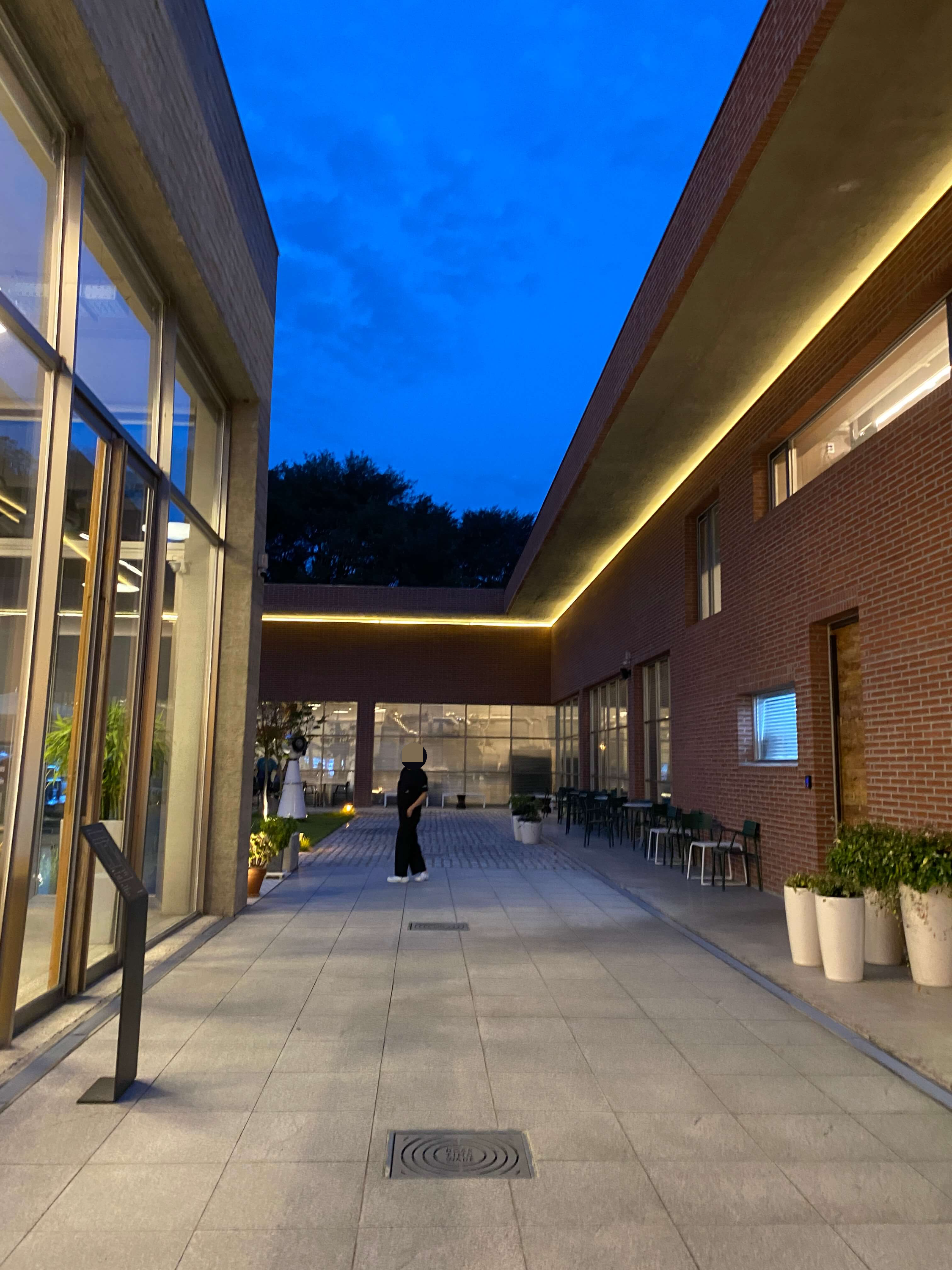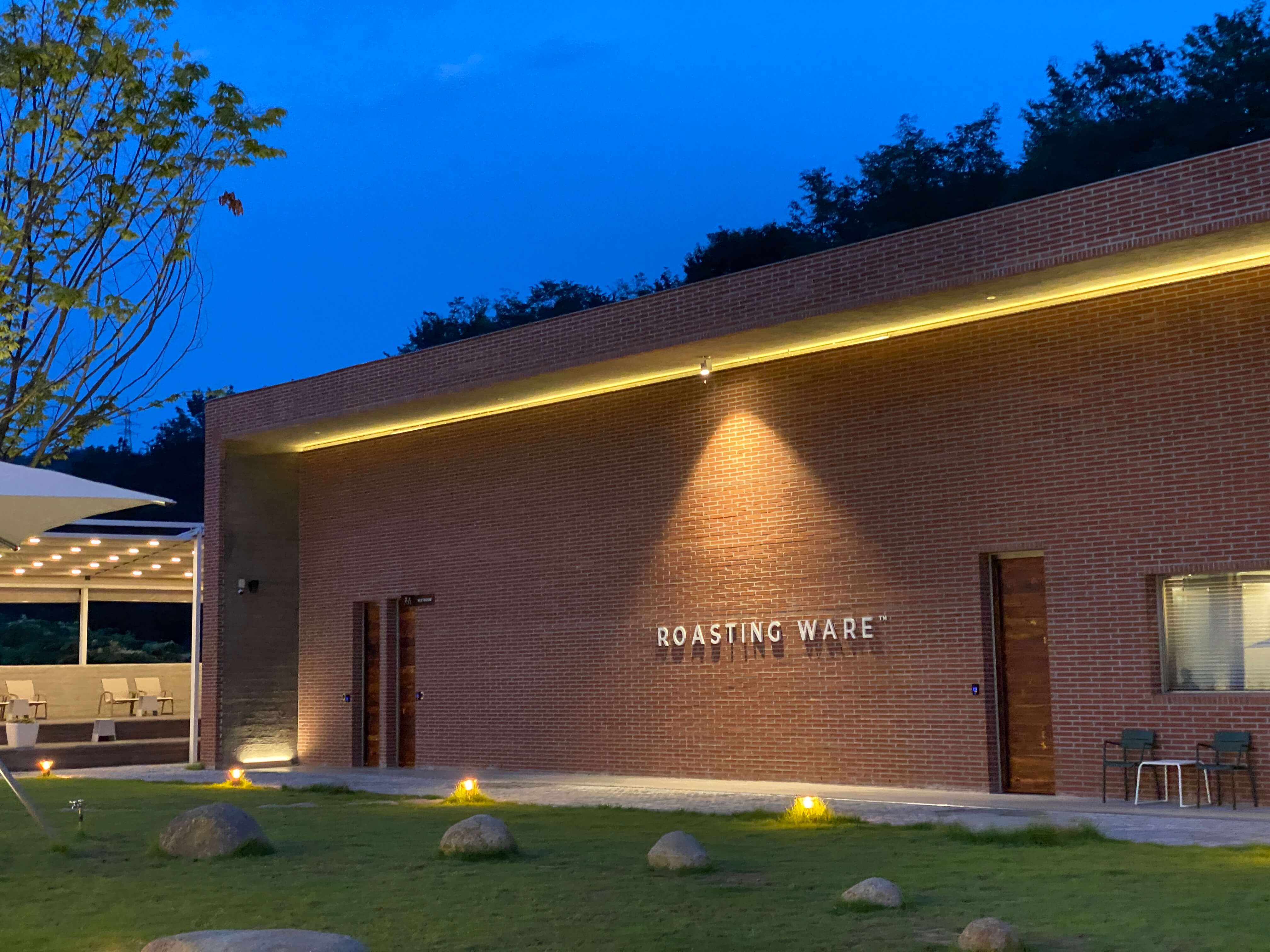 해가 지는 저녁에 로스팅웨어에 방문했어요. 적벽돌과 노랑 노랑한 조명이 주는 분위기가 상당했어요. 대형 카페라 크기만 큰 게 아닐까 했는데 가운데 잔디밭도 연두 연두하고 커다란 바위들도 조약돌처럼 너무 귀여운 모습을 하고 있었어요.