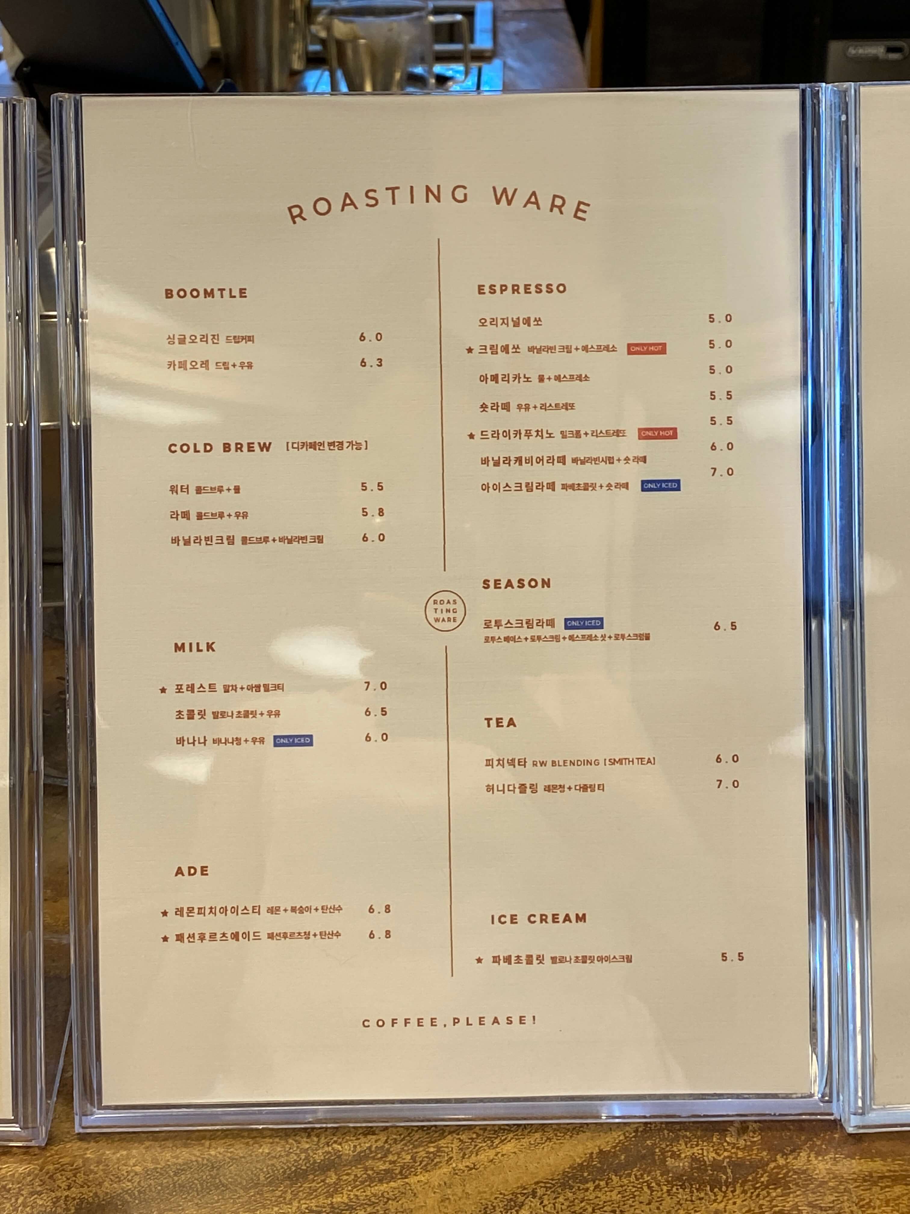 로스팅웨어 메뉴입니다.