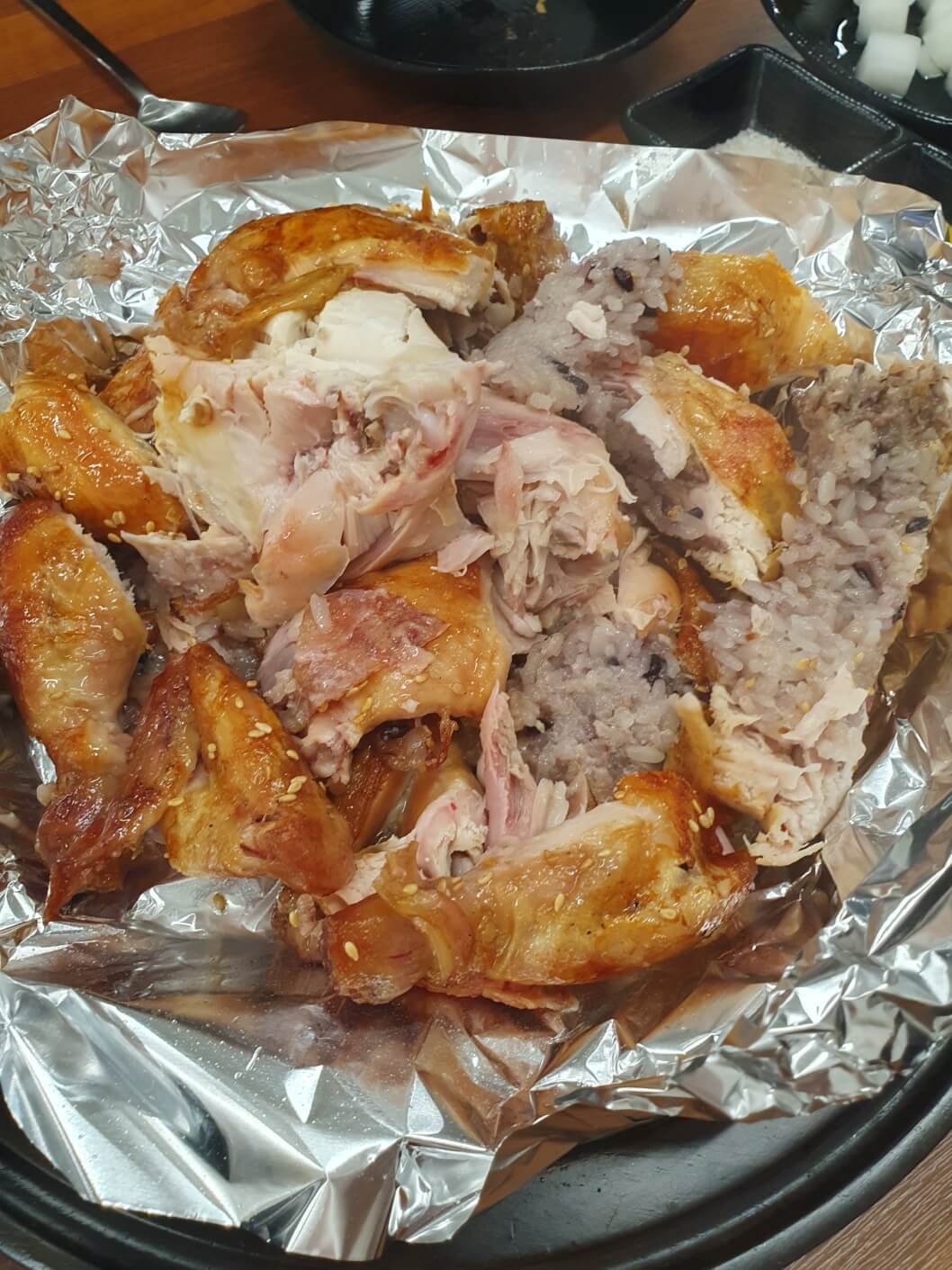 가위로 자르고 가르다 보니 안에 쌀이랑 각종 한방재료가 보였어요. 닭을 가르니깐 한방 향이 더 나더라고요.