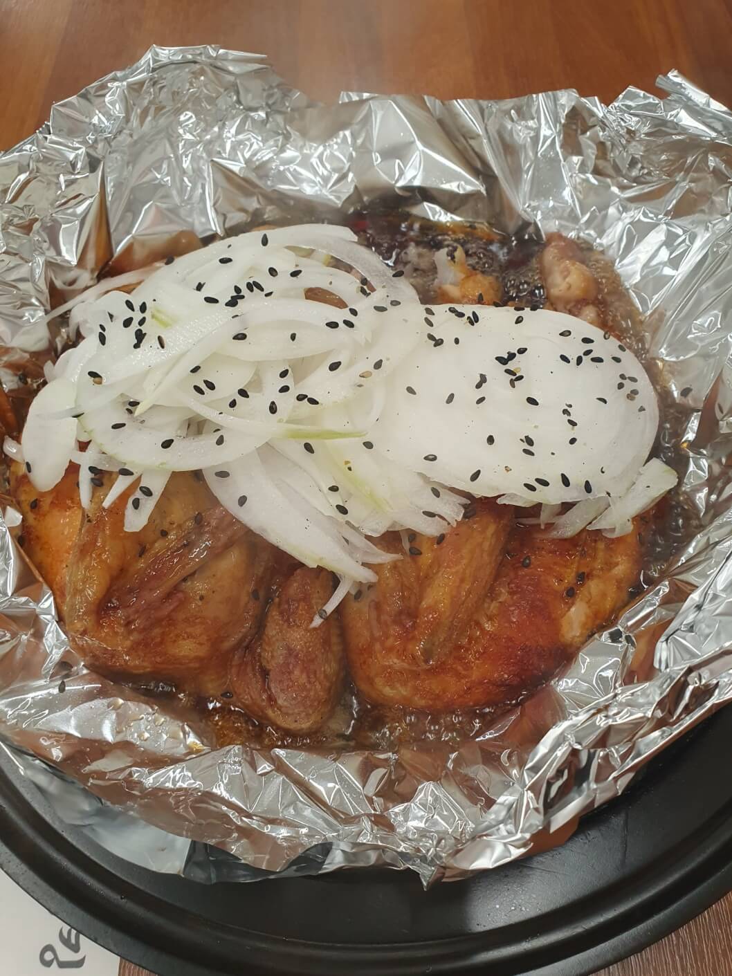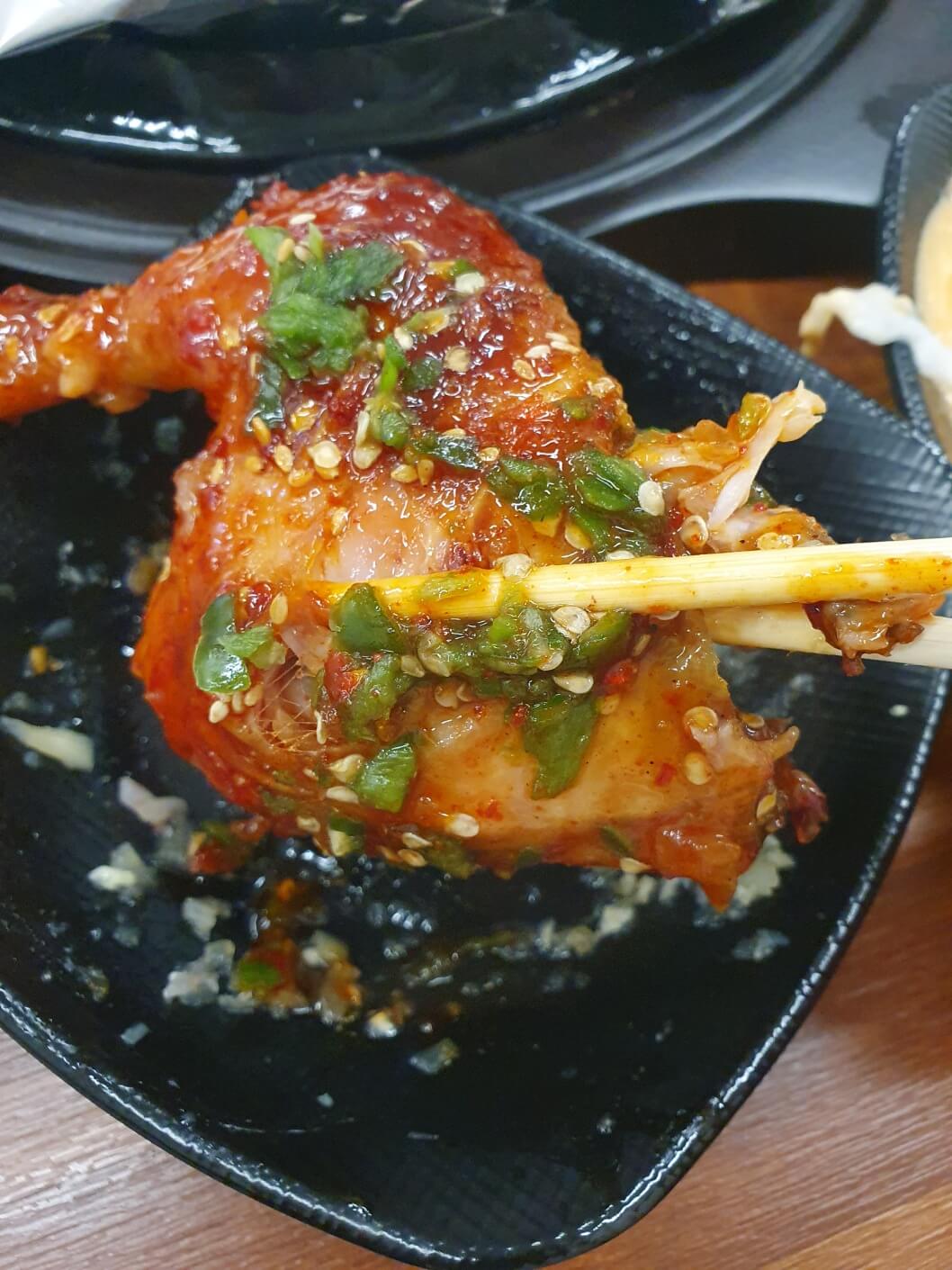 뺏기기 전에 얼른 가져온 닭다리!! ㅎㅎㅎㅎ 한방간장통닭은 채 썬 양파가 올려져 나왔어요. 아무렴 고기들은 채소들이랑 같이 먹어줘야 입가심도 되고 개운하더라고요. 조합이 정말 좋았어요.