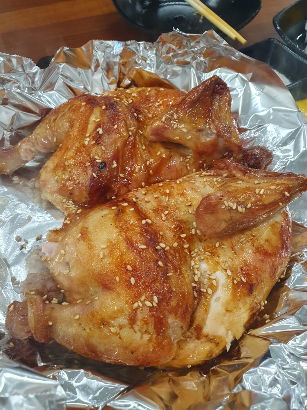 제일 기본 메뉴인 조선한방통닭의 한방통닭입니다. 한눈에 봐도 빛깔이 예술이죠?! 정말 잘 구워져 나왔어요.