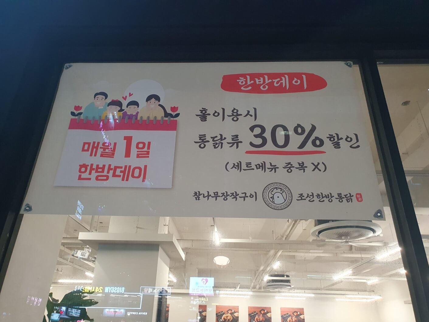 조선한방통닭은 매월 1일은 한방데이로 홀에서 이용할 경우 30%나 할인해 준데요. 대박이지 않나요?! 이런 곳은 생전 처음 봐요!조선한방통닭 가실 계획이 있으신 분들은 1일 방문 추천합니다!! ><