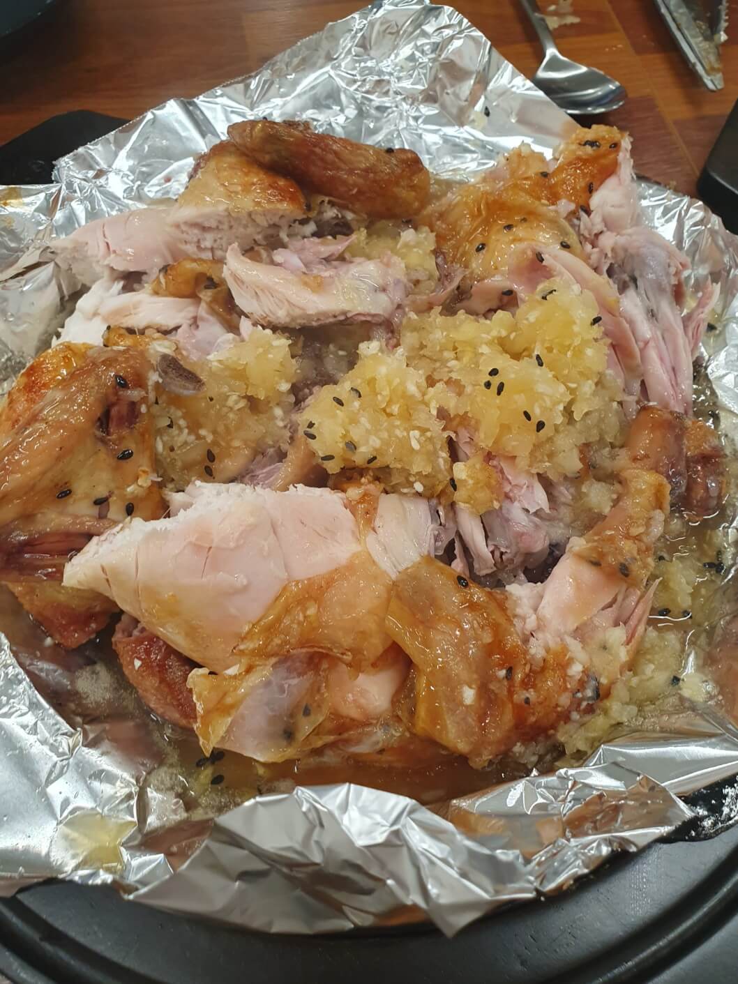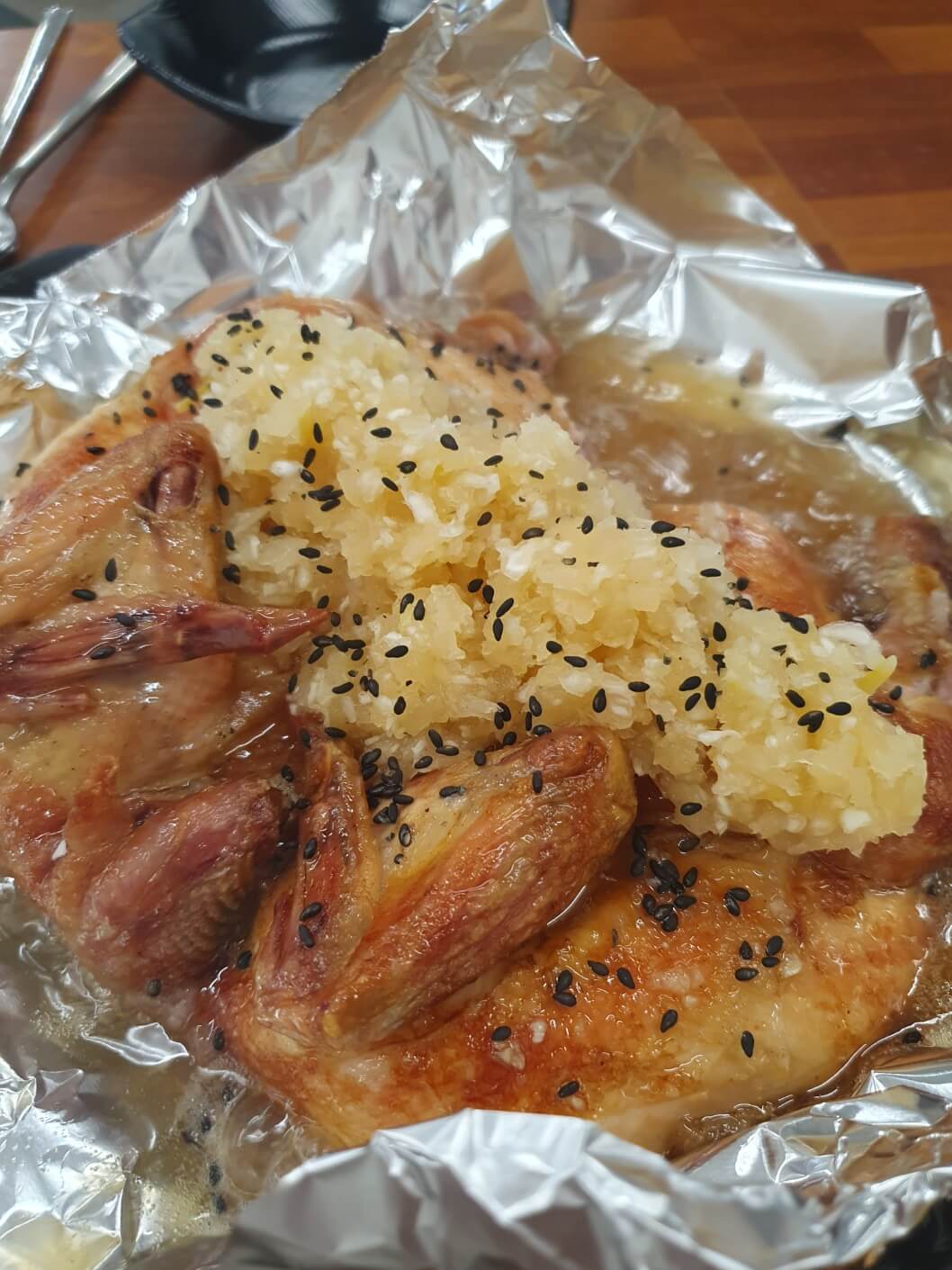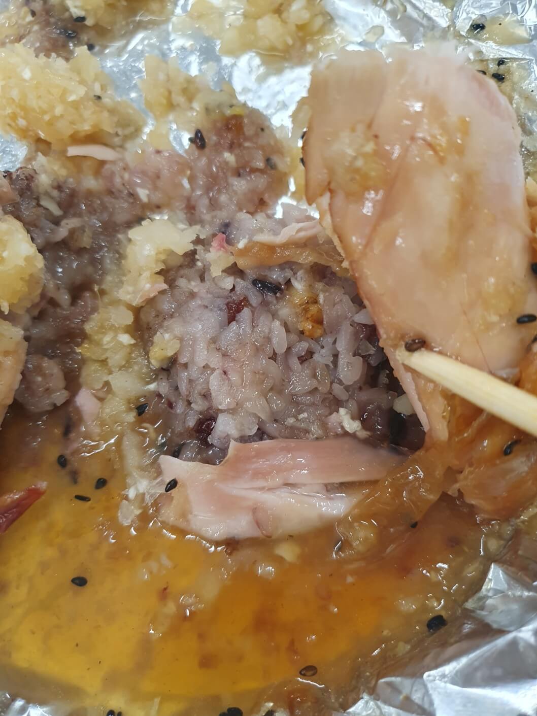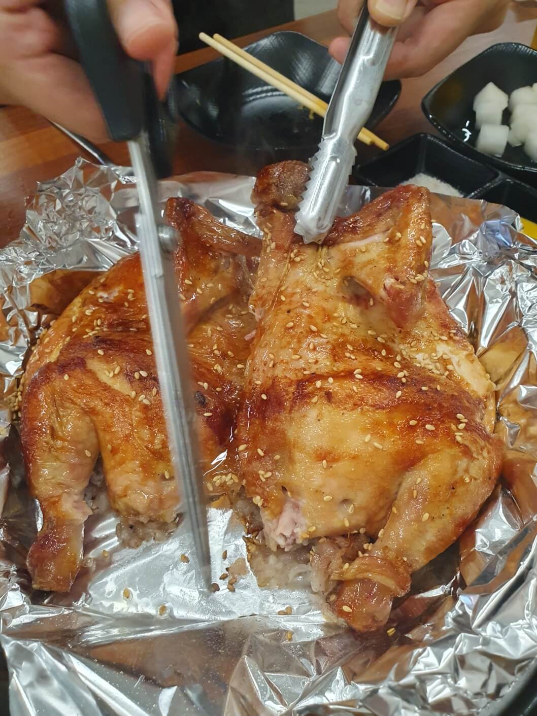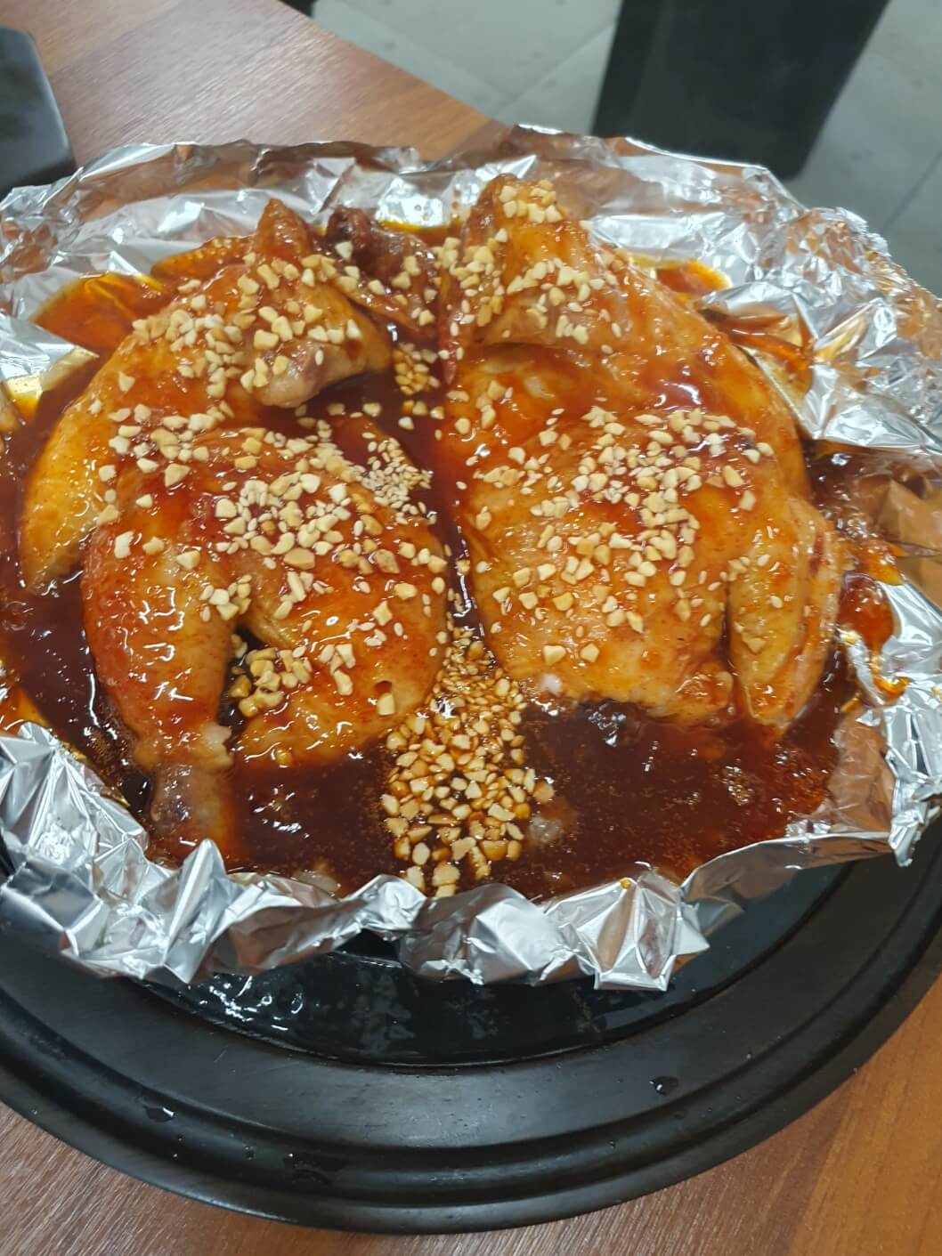 조선한방통닭은 찹쌀, 흑미, 인삼, 대추, 은행, 마늘 등 국내산 한방재료가 닭 속에 들어가 있다고 해요. 그래서 나오자마자 한방 냄새가 확! 나더라고요. 나이가 들면서 튀긴 닭보다는 구운 닭을 더 선호하게 되는데,, 그런 점에서 조선한방통닭이 더 마음에 들었어요. (나이가 들어가나 봅니다. ㅎㅎㅎㅎ)