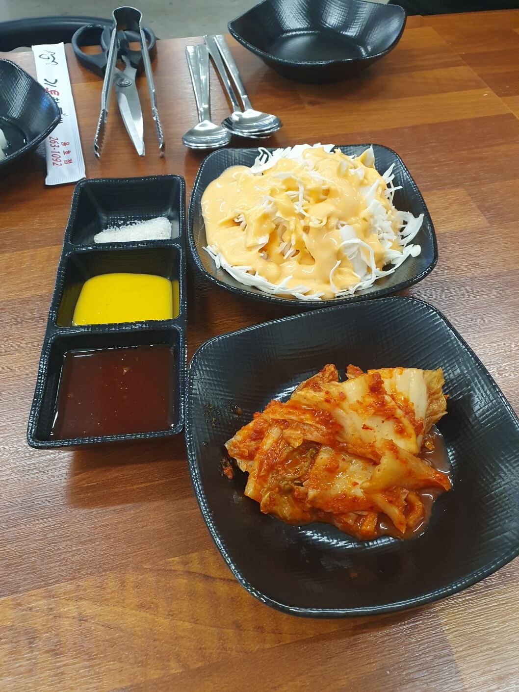 기본으로 주시는 양배추랑 김치 그리고 소스류입니다. 단출해요. 하지만 저는 단출한 기본 상차림을 좋아합니다.