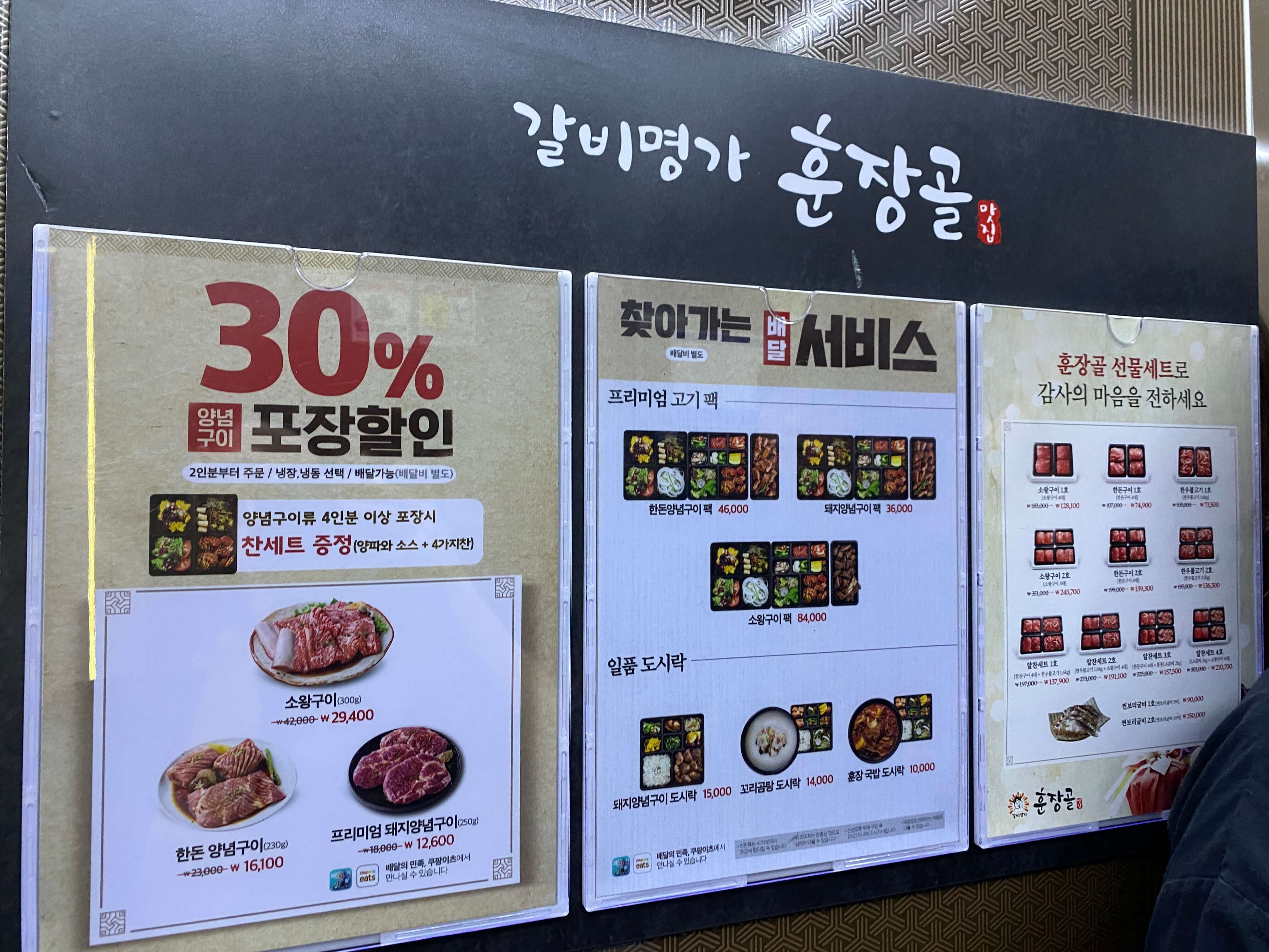훈장골에서는 양념구이는 포장도 가능하며 30% 할인까지 진행중이라고 합니다. 훈장골 식당에서 먹는 것처럼 구성된 팩으로 배달도 가능하다고 하네요.