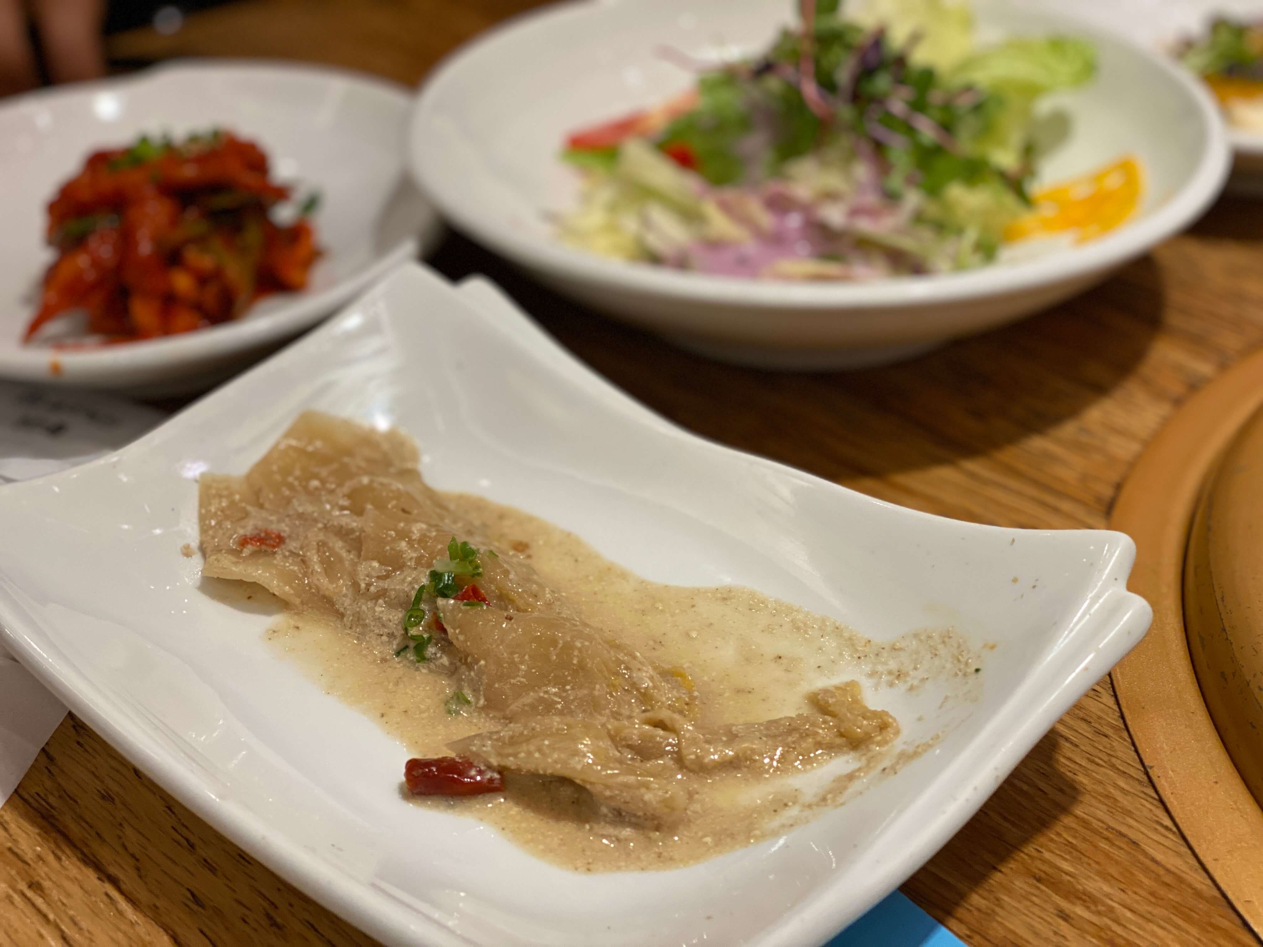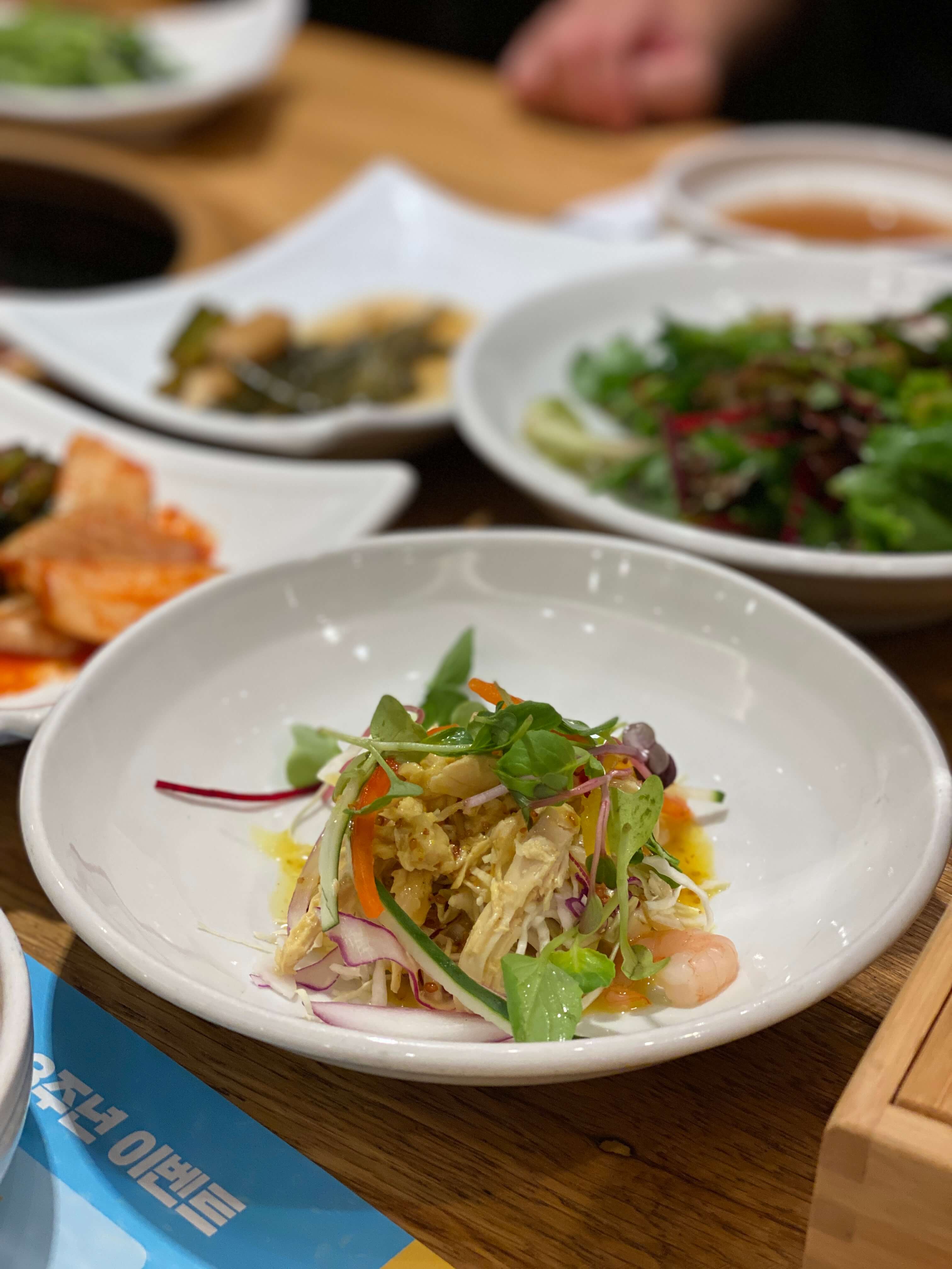 훈장골은 기본 반찬부터가 엄청 깔끔하고 고급지게 나오더라고요.. 특히 닭가슴살 샐러드(?)가 정말 맛있었어요. 겨자맛과 함께 새콤 달콤한 맛이 완전 제 입맛에 딱이었습니다. 3접시 정도 먹은 거 같아요.
