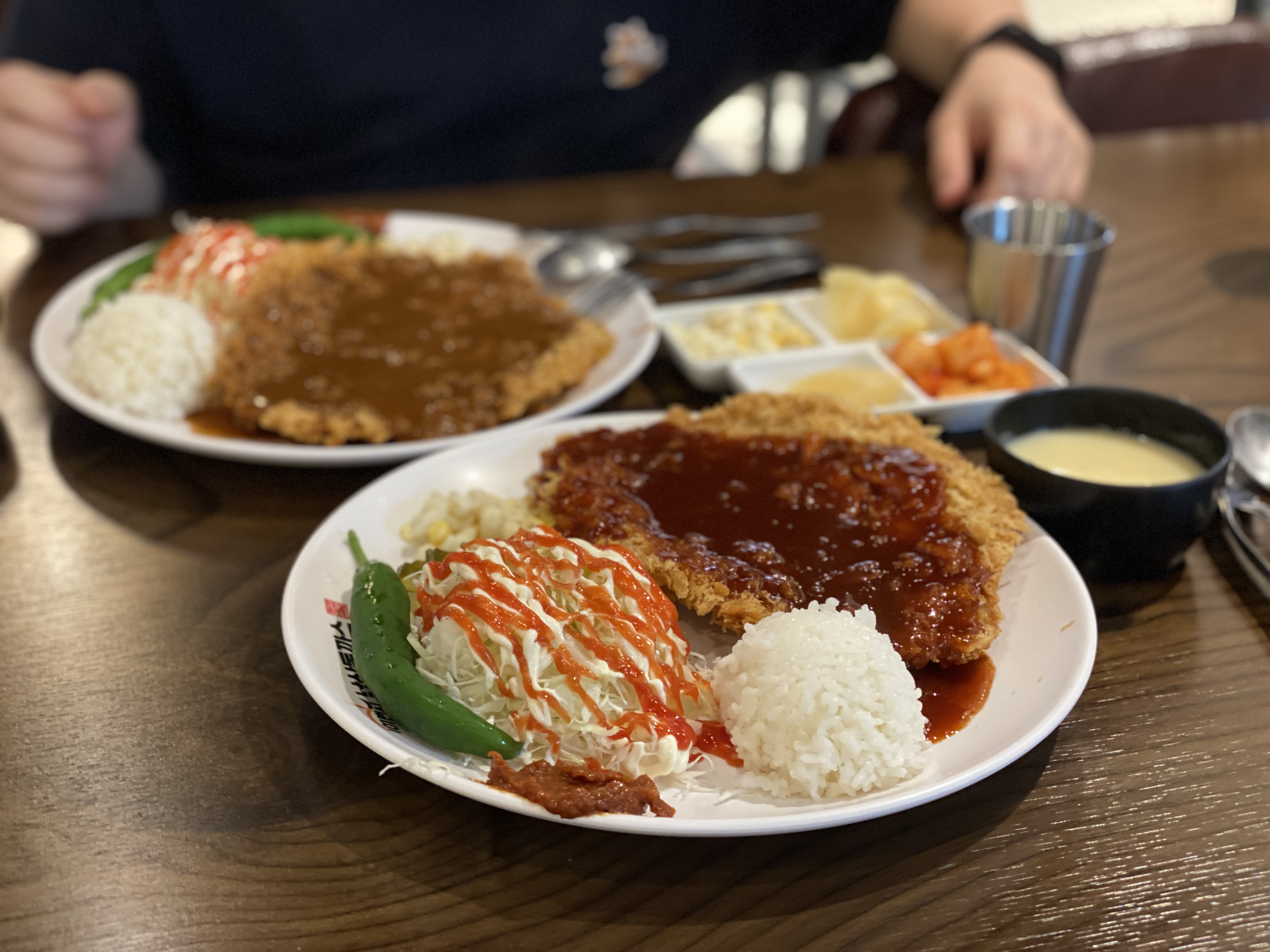 남산 왕 돈까스는 거의 활짝 핀 손보다 조금 더 큰 사이즈였습니다. 남산 왕 돈까스는 경양식 돈까스로 소스가 위에 뿌려져서 나왔어요. 그리고 독특한 점을 꼽으라면 고추를 하나씩 같이 주더라고요. 새롭지만 반가운 조합이랄까요?
