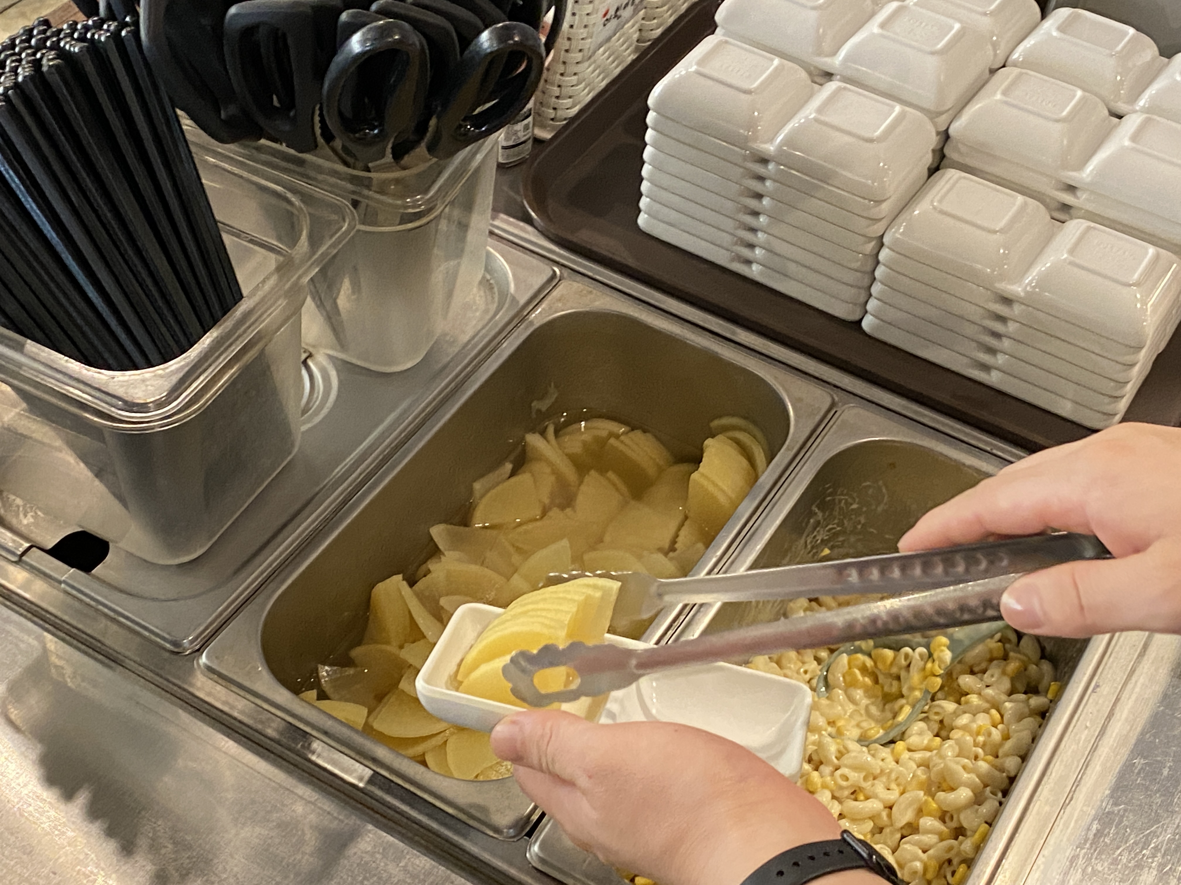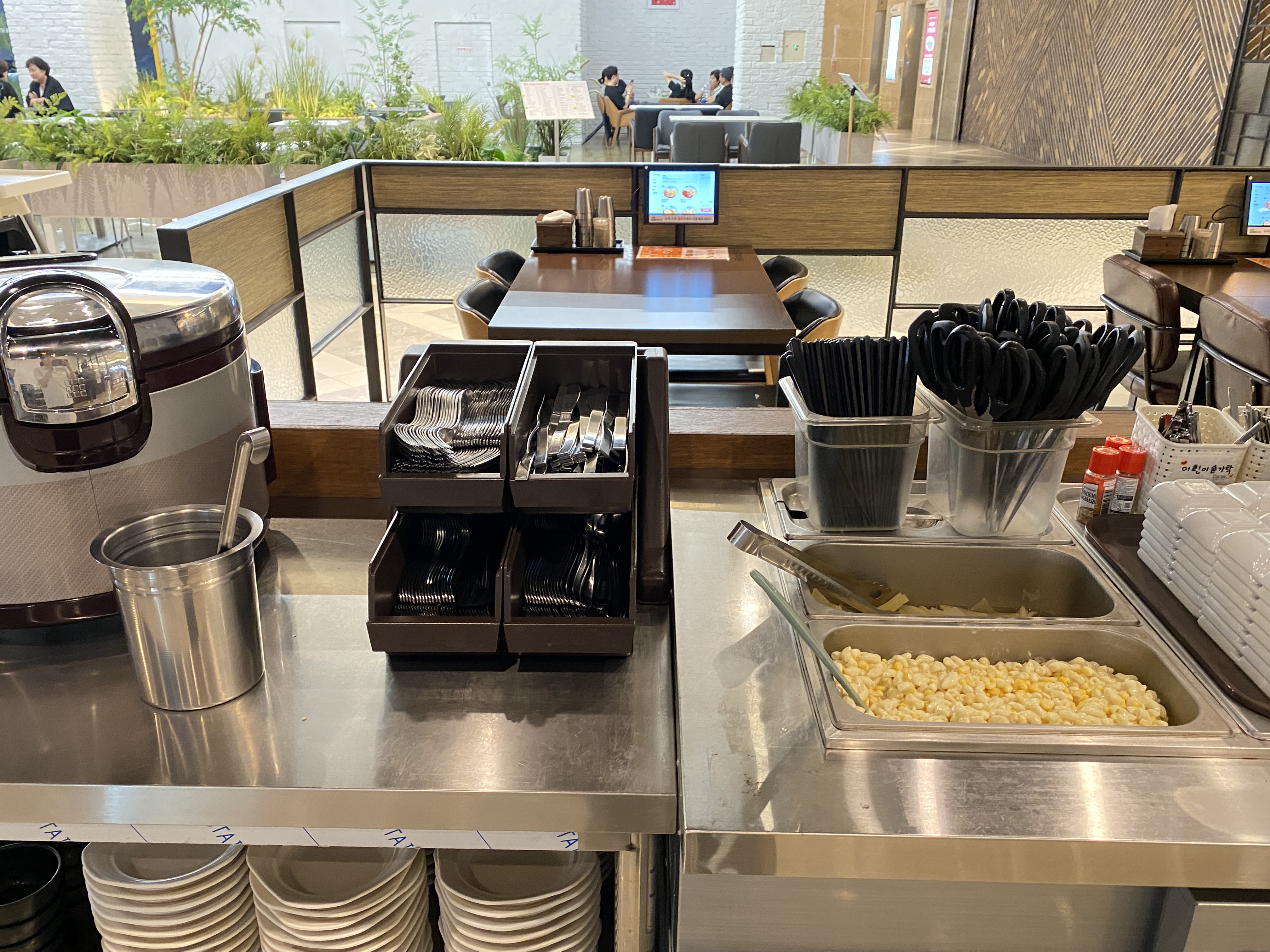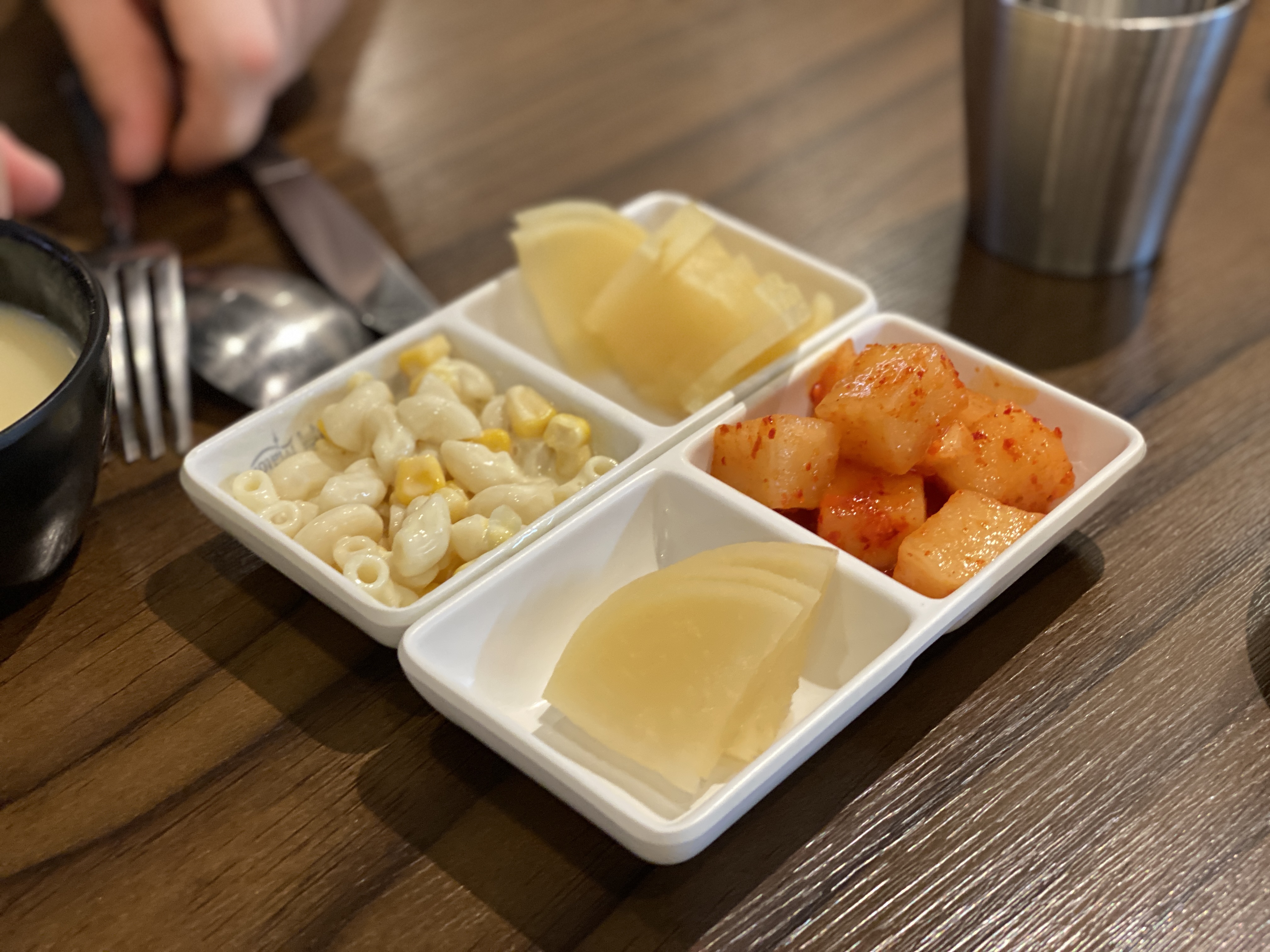 101번지남산돈까스에서는 기본 반찬이 나오지는 않고 직접 셀프바에서 먹을만큼 가져가면 됩니다. 수프도 셀프바에 준비되어있어요.