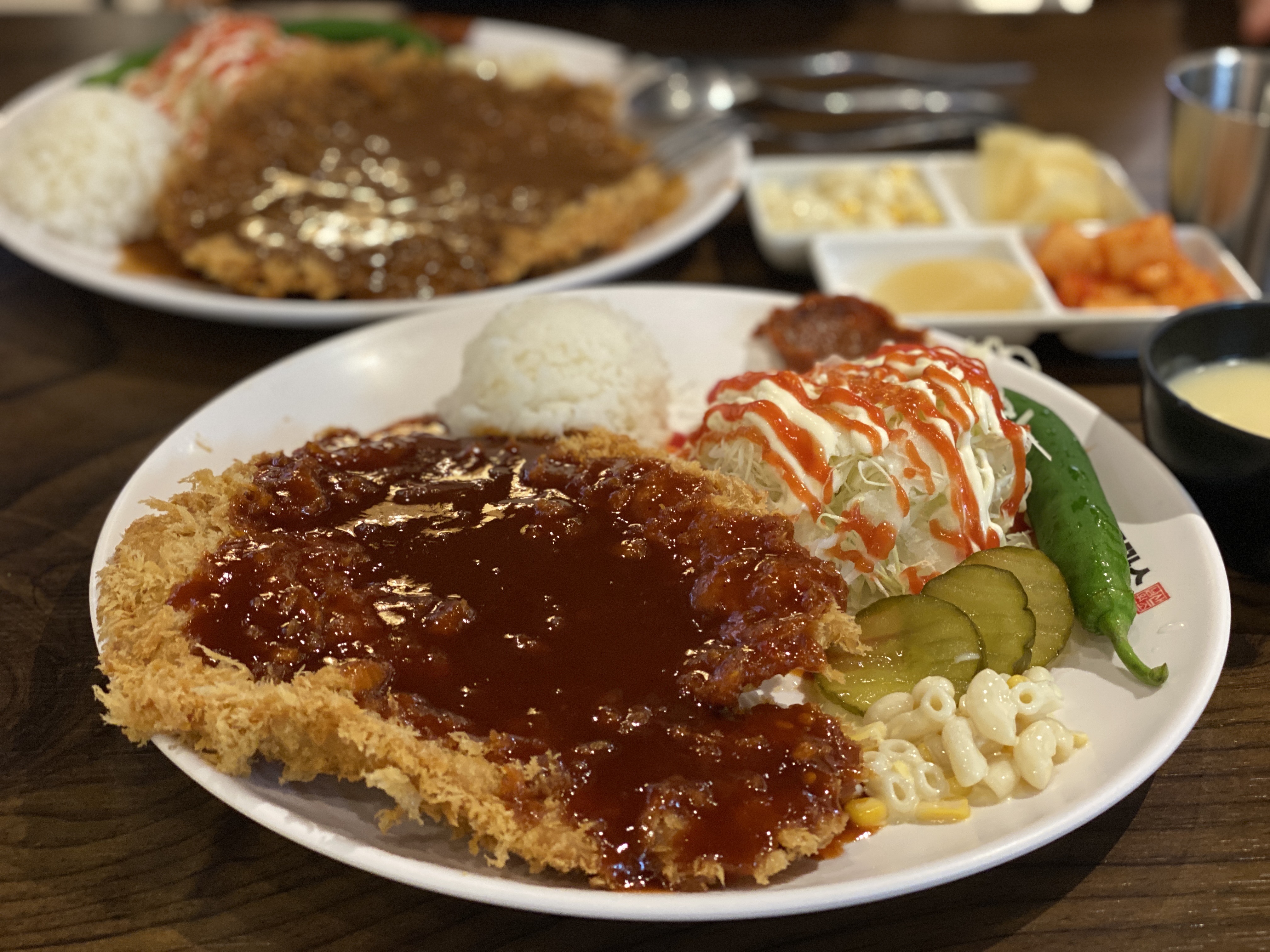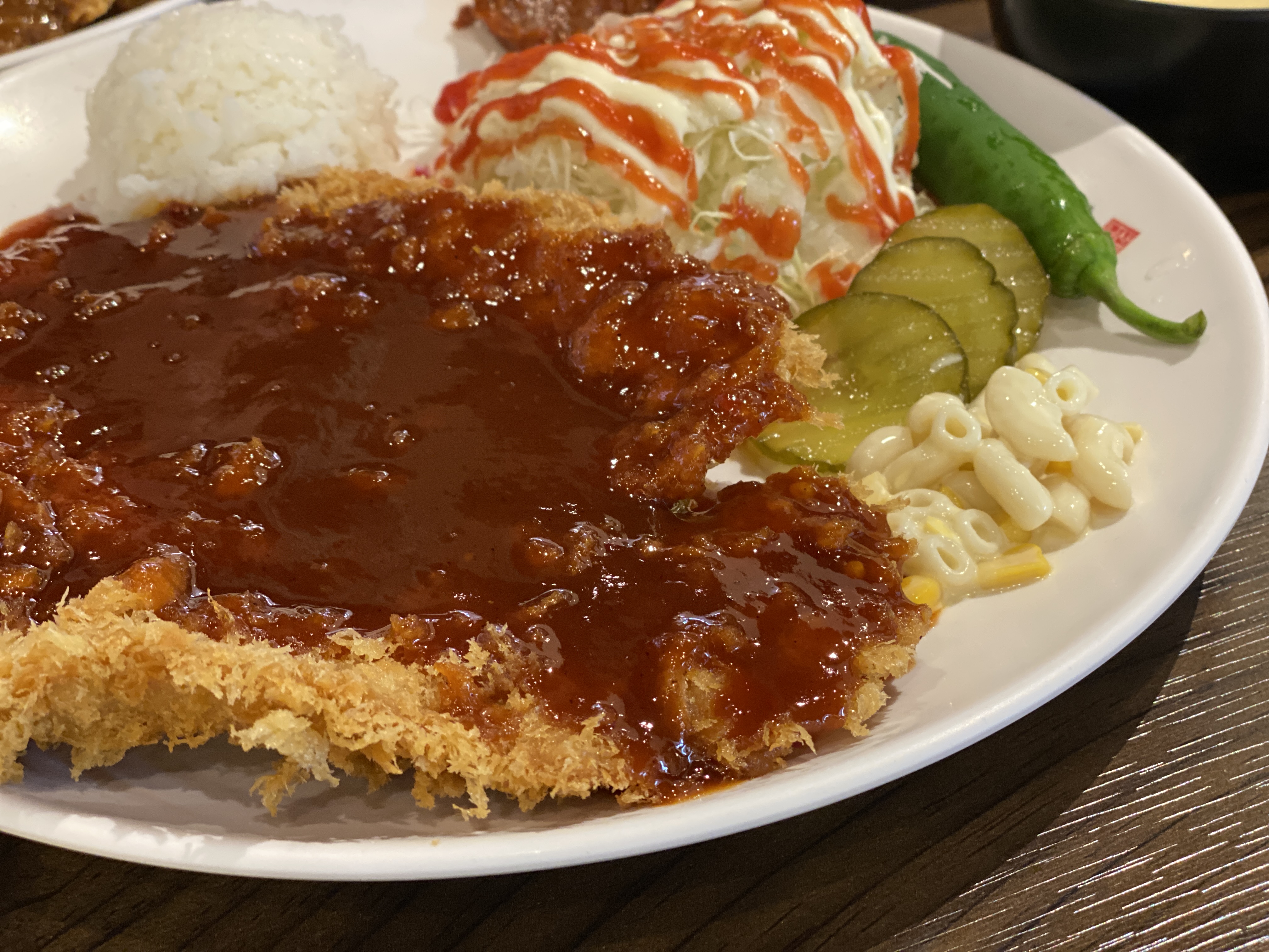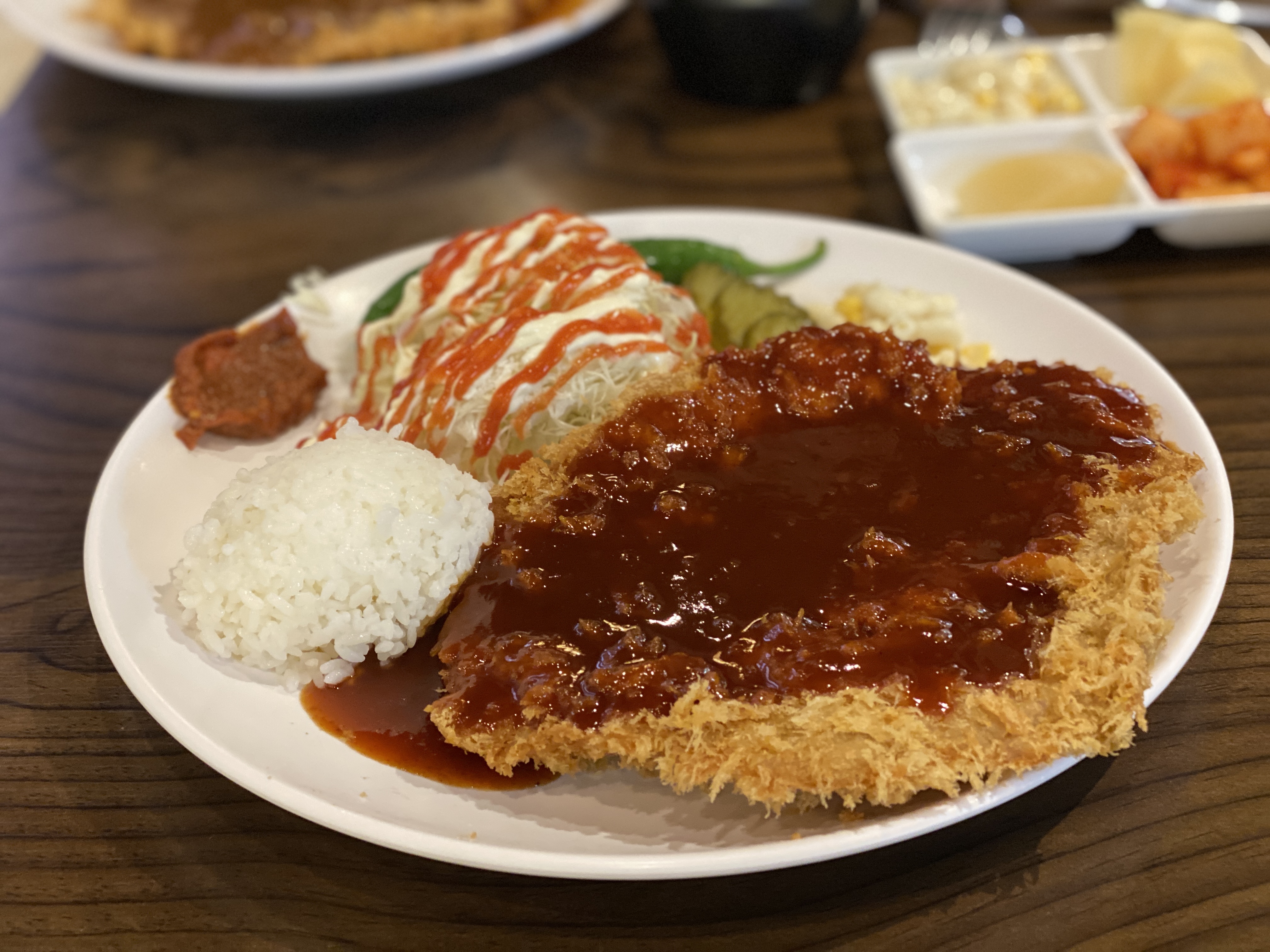 매운 돈까스는 왕돈까스랑 비슷한 크기로 제법 크게 나왔어요. 왕돈까스 위에 일반 돈까스 소스가 아닌 매운 소스가 뿌려졌다는 점이 유일한 차이점 같아 보이더라고요. 나올 때부터 빨간 소스가 눈에 확 들어왔는데 매운 향까지도 스멀 스멀나는 것이 너무 맵지 않을까 걱정이 조금 되긴 했습니다.