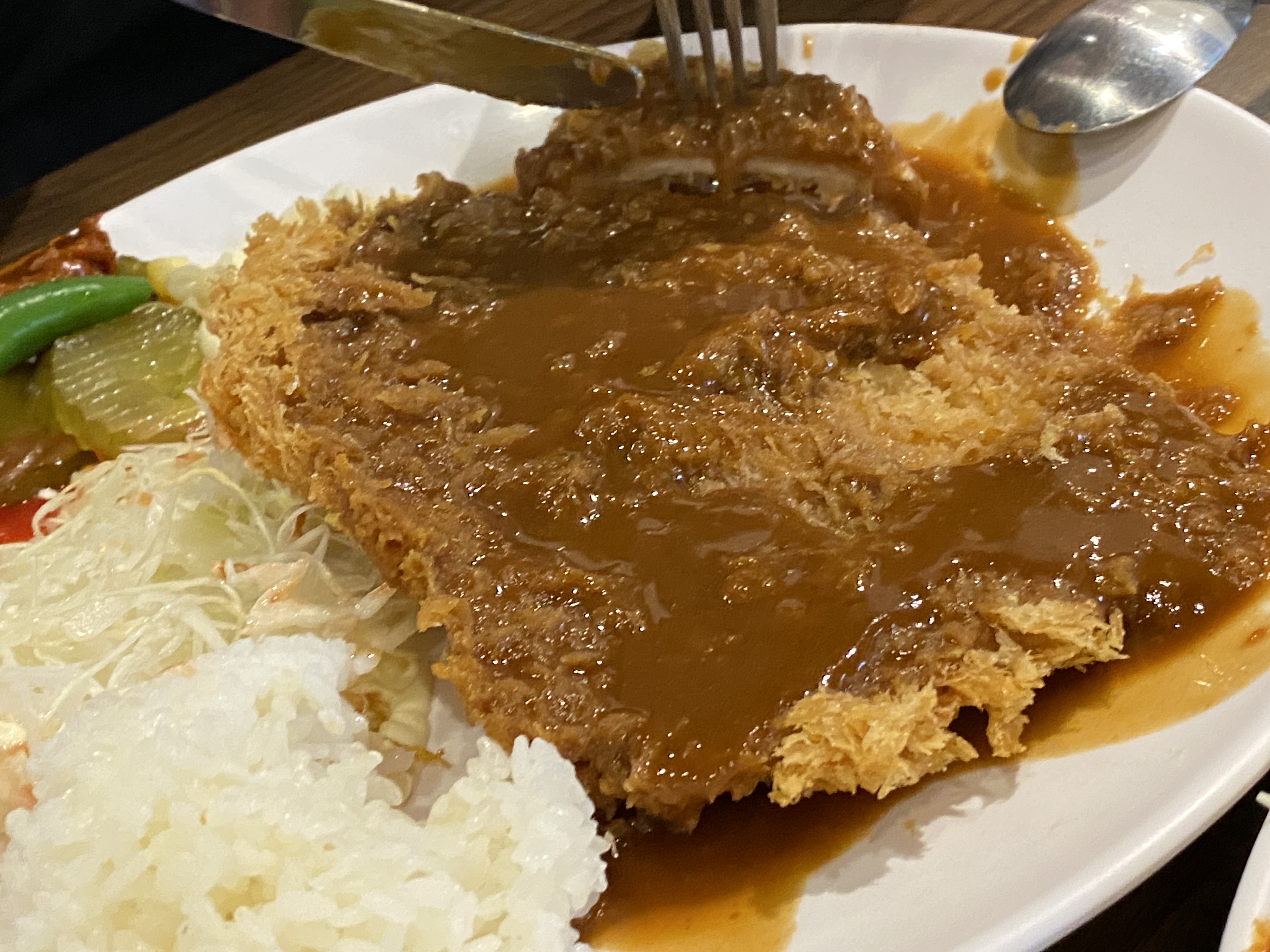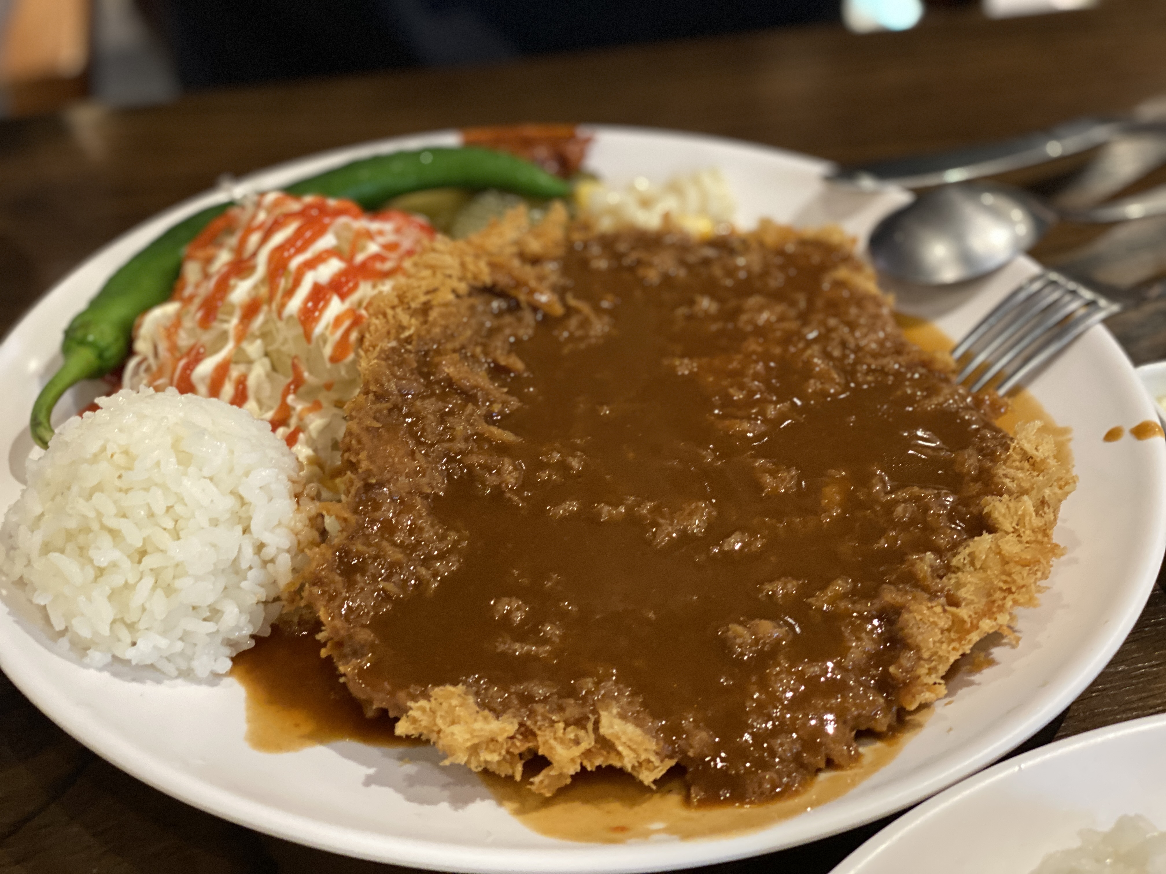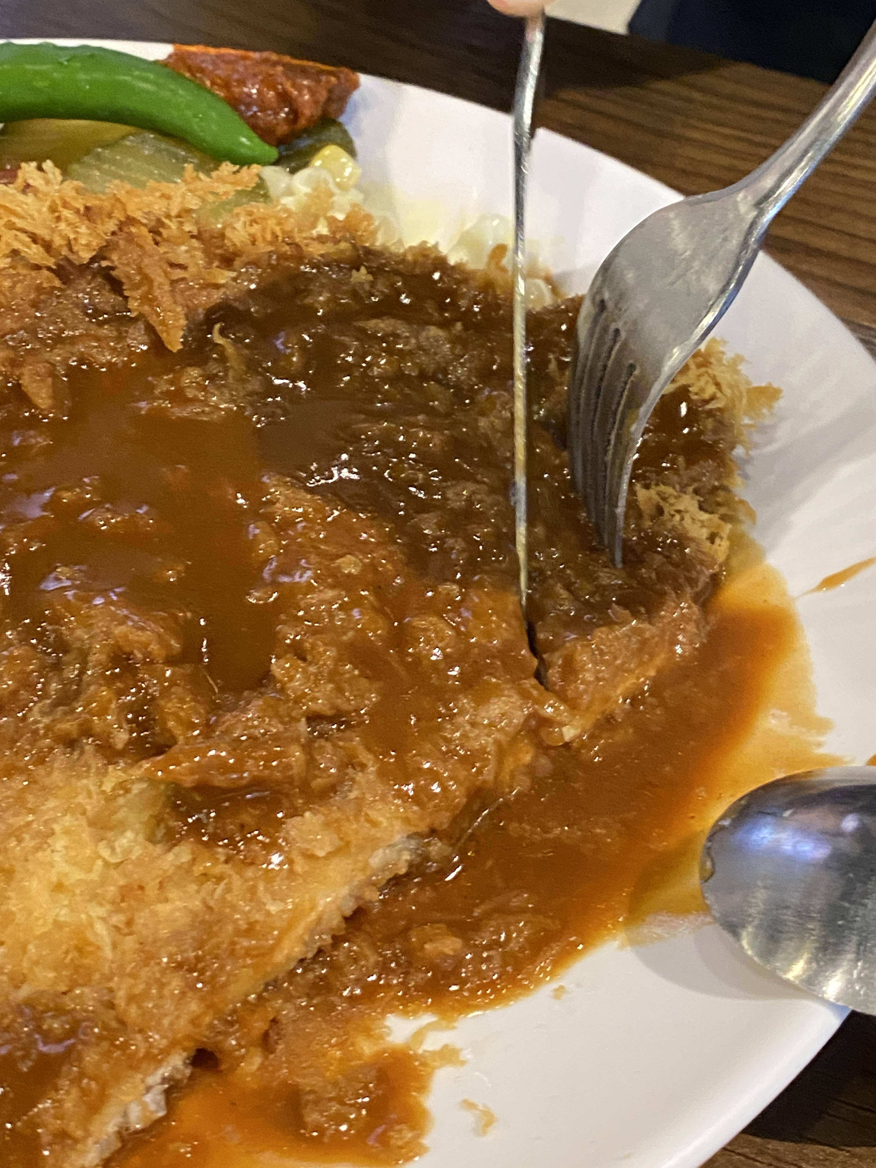 매운 돈까스는 왕돈까스랑 비슷한 크기로 제법 크게 나왔어요. 왕돈까스 위에 일반 돈까스 소스가 아닌 매운 소스가 뿌려졌다는 점이 유일한 차이점 같아 보이더라고요. 나올 때부터 빨간 소스가 눈에 확 들어왔는데 매운 향까지도 스멀 스멀나는 것이 너무 맵지 않을까 걱정이 조금 되긴 했습니다.