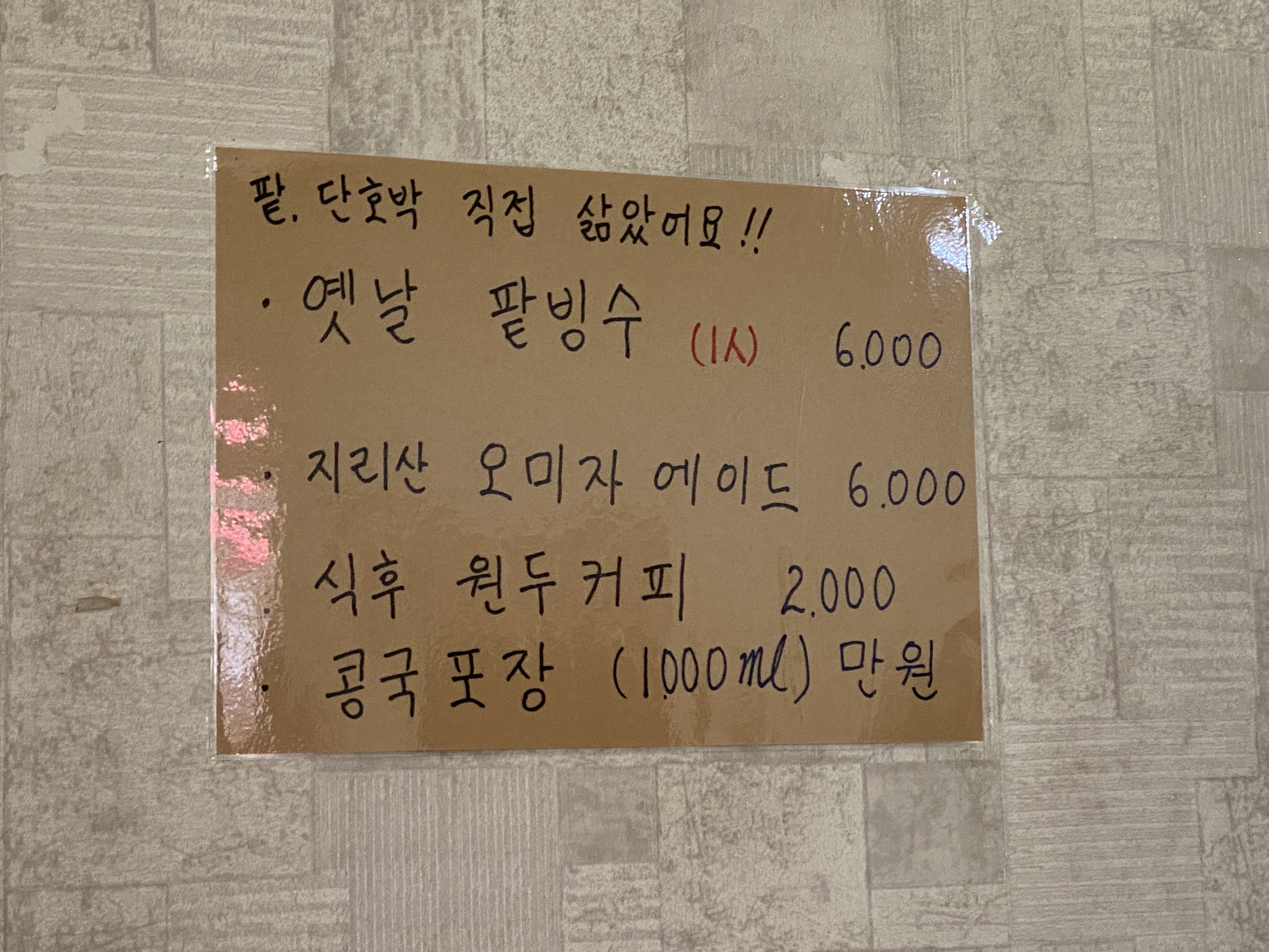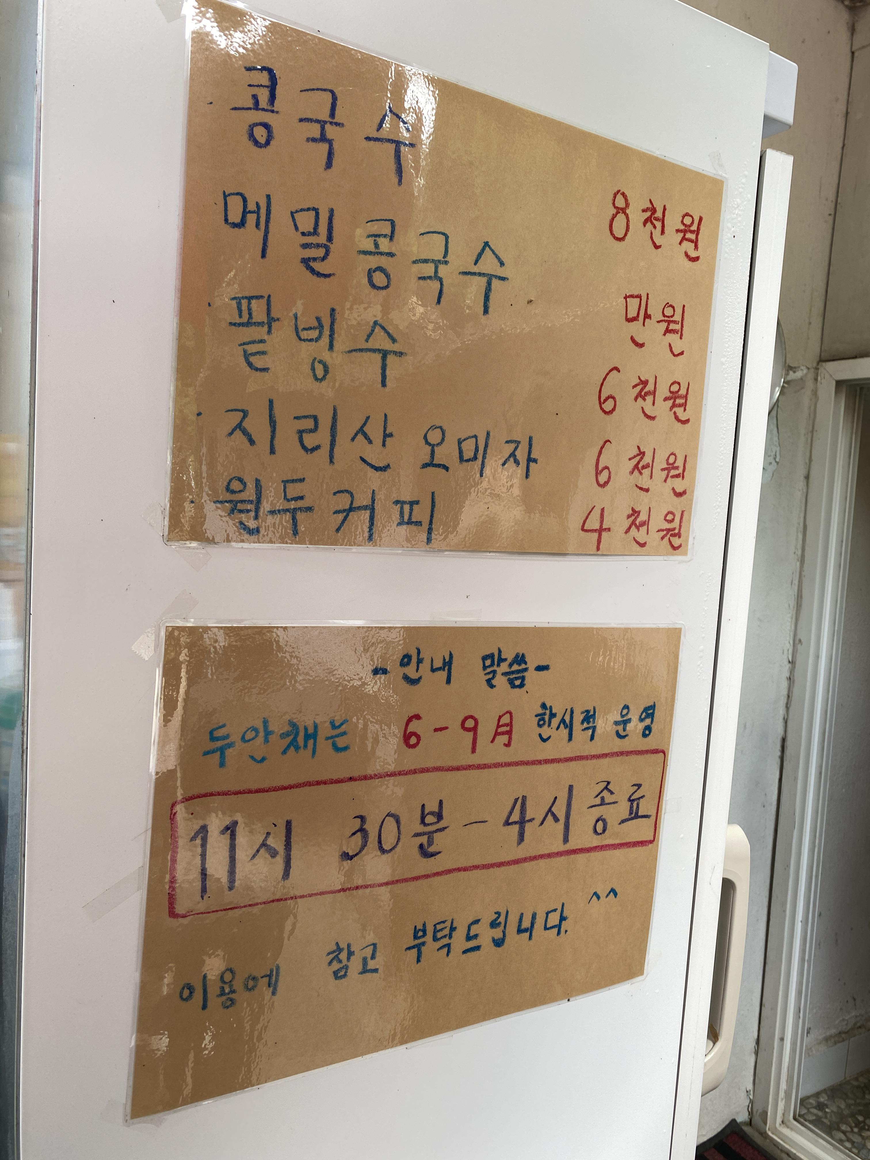 콩국수가 넘 맛있어서 팥빙수도 주문하려고 여쭤봤더니 손님이 너무 많고 일손이 부족해서 팥빙수는 안된다고 하시더라고요 ㅠㅠㅠ 넘 아쉽!! 팥빙수 때문에라도,,, 메밀 콩국수 때문에라도,,, 재방문해야겠어요 ㅎㅎㅎㅎ