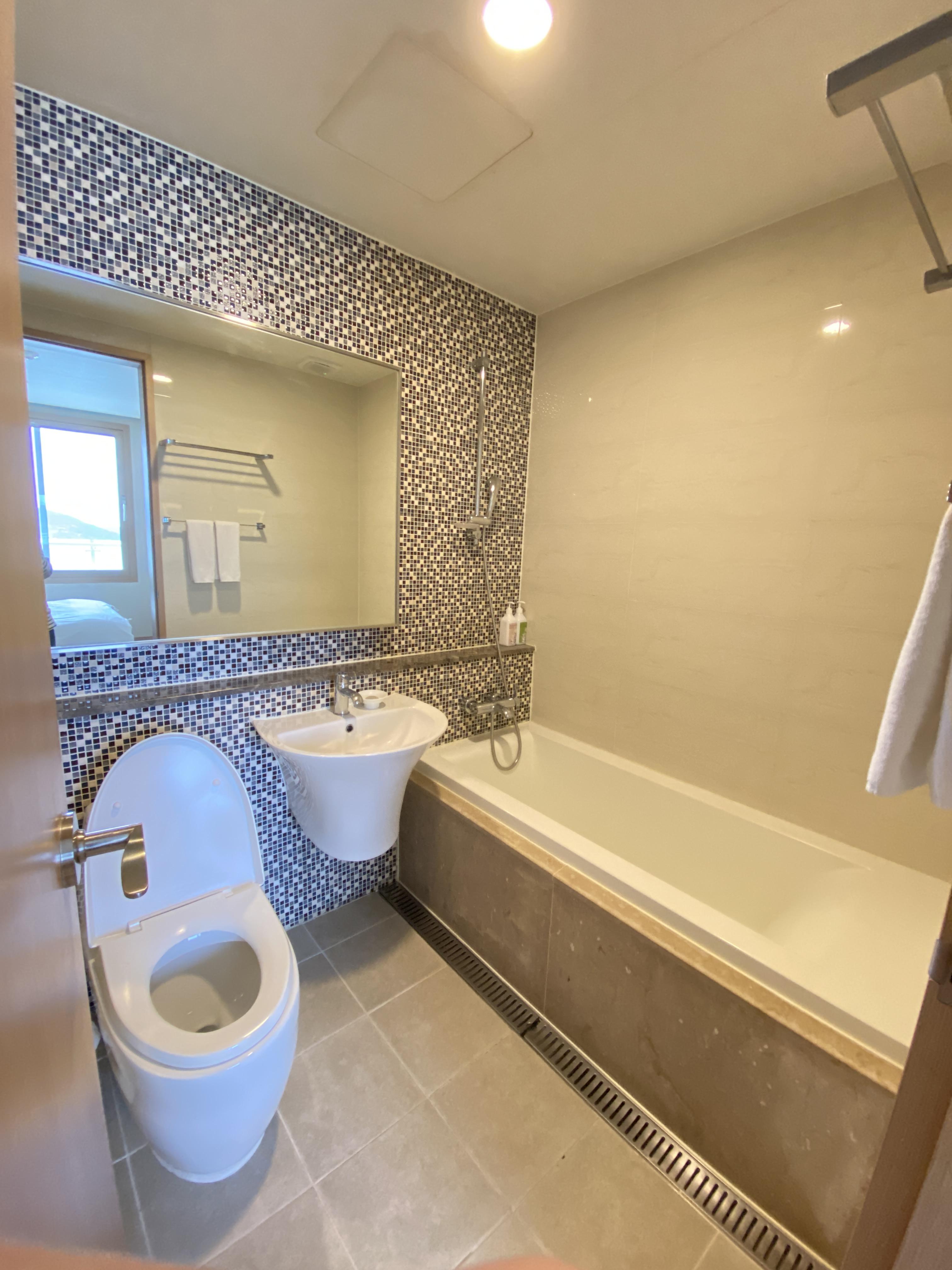 스위트룸의 양실입니다. 더블베드가 하나 있고 화장대, 북박이장 안에는 침구 한 세트가 더 준비되어 있으며 욕조가 딸린 화장실이 하나 붙어있습니다. 양실 또한 큰 창이 있어 바다가 바로 보이는 오션뷰라 조명도 좋습니다.